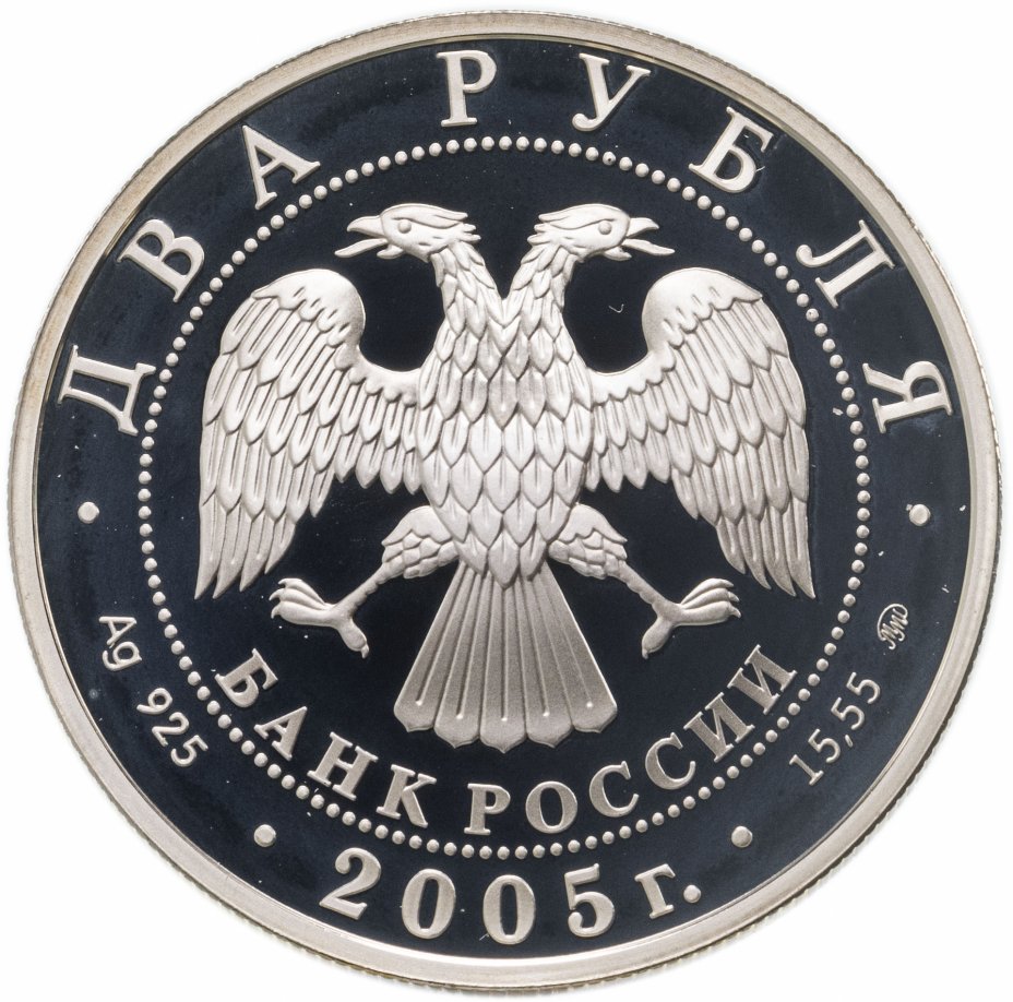 Вверху вдоль канта номинал «ДВА РУБЛЯ», внизу слева химическое название «Ag» и проба «925» металла, внизу по центру год выпуска «2005 г.», внизу справа чистый вес находящегося в монете драгоценного металла «15,55» и монограмма монетного двора «ММД». В середине в ободке из точек двуглавый орел под ним с внутренней стороны точечного ободка слова «БАНК РОССИИ».
