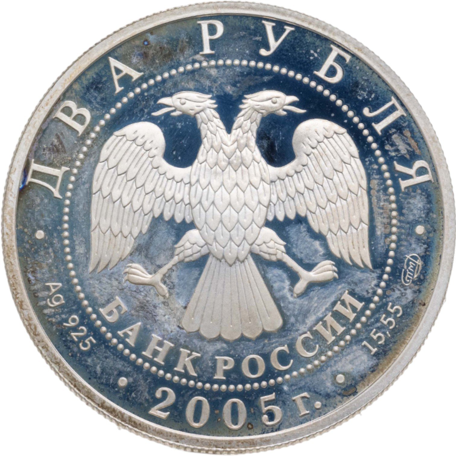 Вверху вдоль канта номинал «ДВА РУБЛЯ», внизу слева химическое название «Ag» и проба «925» металла, внизу по центру год выпуска «2005 г.», внизу справа чистый вес находящегося в монете драгоценного металла «15,55» и монограмма монетного двора «СПМД». В середине в ободке из точек двуглавый орел под ним с внутренней стороны точечного ободка слова «БАНК РОССИИ».