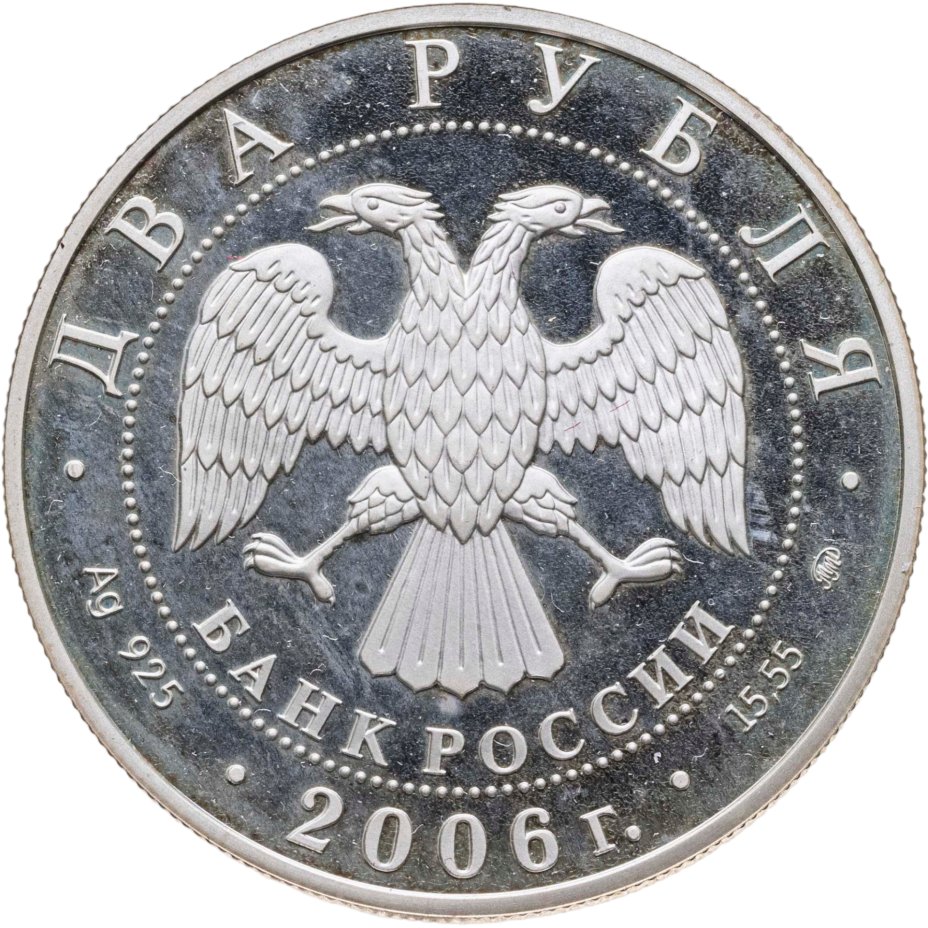 Вверху вдоль канта номинал «ДВА РУБЛЯ», внизу слева химическое название «Ag» и проба «925» металла, внизу по центру год выпуска «2006 г.», внизу справа чистый вес находящегося в монете драгоценного металла «15,55» и монограмма монетного двора «ММД». В середине в ободке из точек двуглавый орел под ним с внутренней стороны точечного ободка слова «БАНК РОССИИ».
