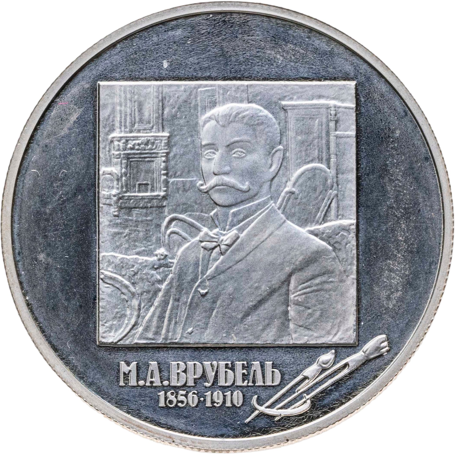 Автопортрет М.А. Врубеля, под ним – надпись: «М.А. ВРУБЕЛЬ» и даты «1856-1910», справа – палитра и две кисти.