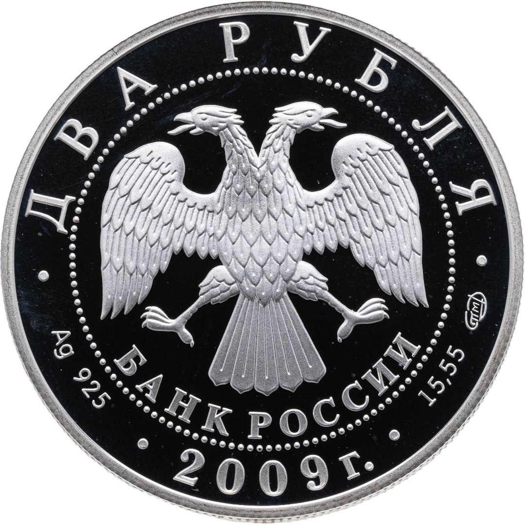 Вверху вдоль канта номинал «ДВА РУБЛЯ», внизу слева химическое название «Ag» и проба «925» металла, внизу по центру год выпуска «2009 г.», внизу справа чистый вес находящегося в монете драгоценного металла «15,55» и монограмма монетного двора «СПМД». В середине в ободке из точек двуглавый орел под ним с внутренней стороны точечного ободка слова «БАНК РОССИИ».