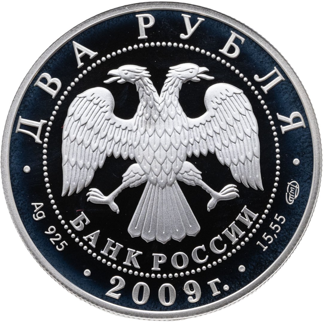 Вверху вдоль канта номинал «ДВА РУБЛЯ», внизу слева химическое название «Ag» и проба «925» металла, внизу по центру год выпуска «2009 г.», внизу справа чистый вес находящегося в монете драгоценного металла «15,55» и монограмма монетного двора «СПМД». В середине в ободке из точек двуглавый орел под ним с внутренней стороны точечного ободка слова «БАНК РОССИИ».