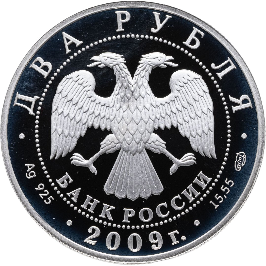 Вверху вдоль канта номинал «ДВА РУБЛЯ», внизу слева химическое название «Ag» и проба «925» металла, внизу по центру год выпуска «2009 г.», внизу справа чистый вес находящегося в монете драгоценного металла «15,55» и монограмма монетного двора «СПМД». В середине в ободке из точек двуглавый орел под ним с внутренней стороны точечного ободка слова «БАНК РОССИИ».