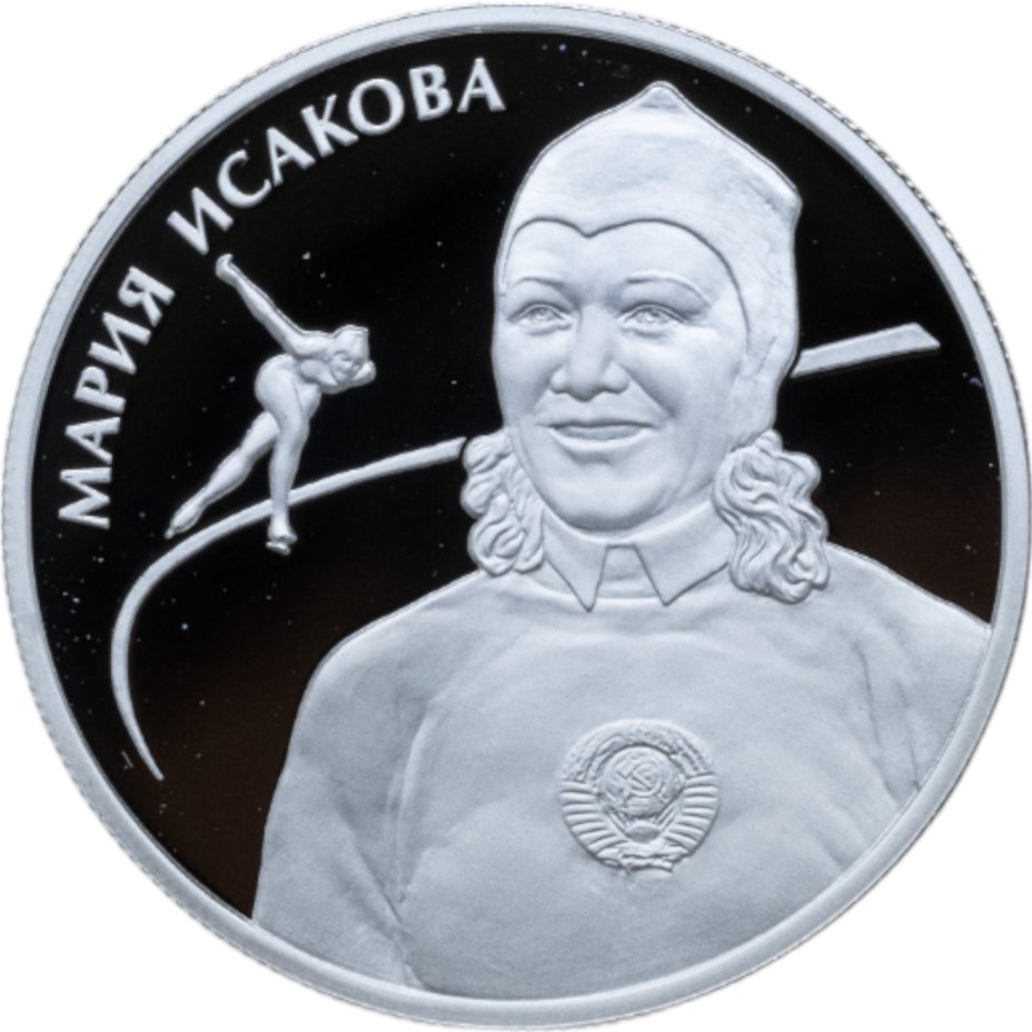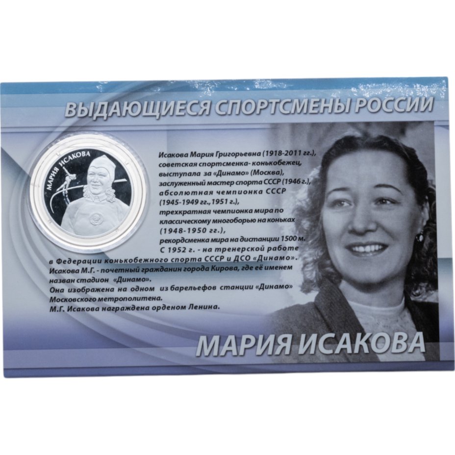 Cправа на зеркальном поле диска - погрудный портрет Исаковой М.Г. в спортивной форме сборной команды СССР, слева - фигурка конькобежки на ледовой дорожке и надпись вдоль канта: "МАРИЯ ИСАКОВА".