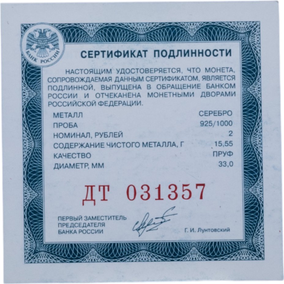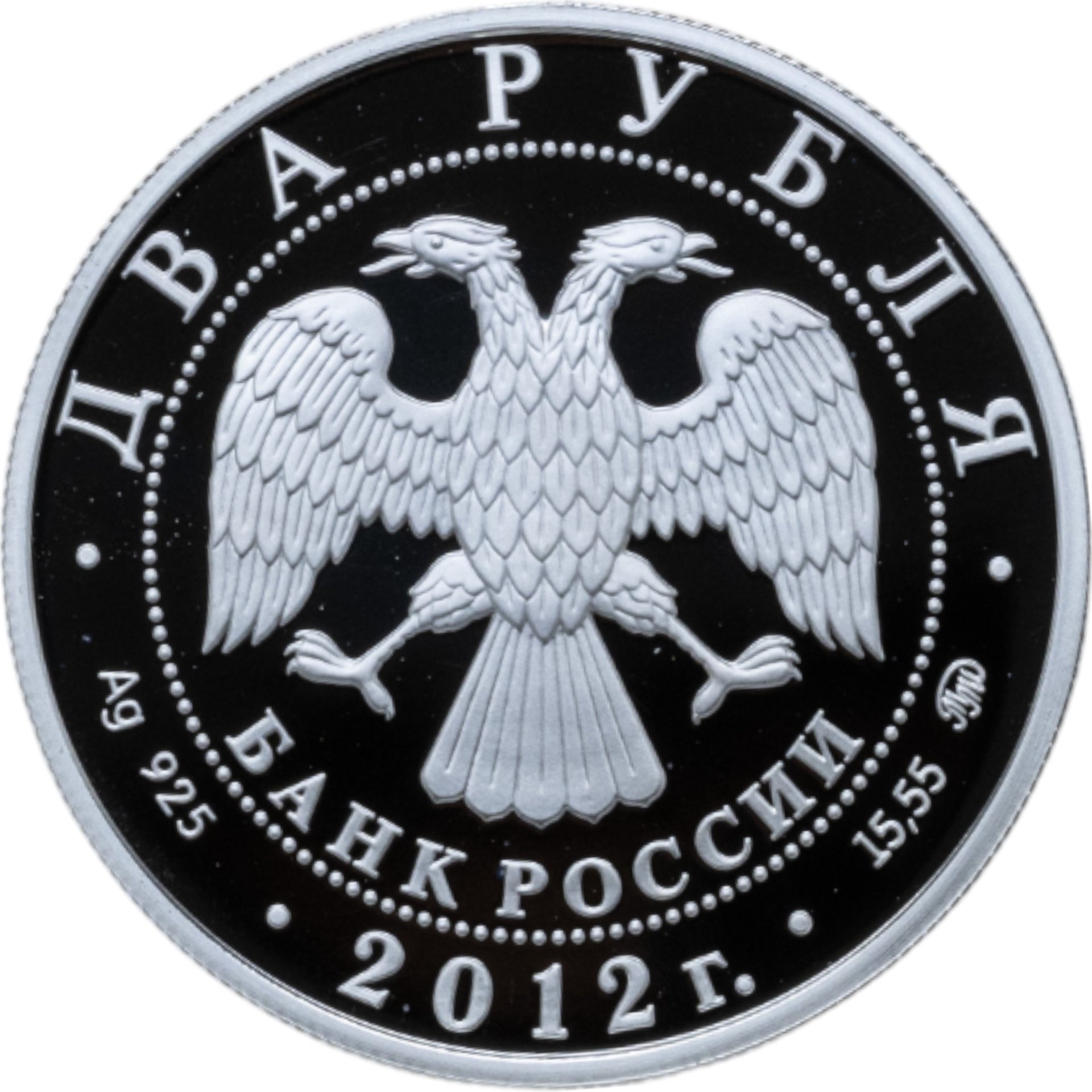 Вверху вдоль канта номинал «ДВА РУБЛЯ», внизу слева химическое название «Ag» и проба «925» металла, внизу по центру год выпуска «2012 г.», внизу справа чистый вес находящегося в монете драгоценного металла «15,55» и монограмма монетного двора «ММД». В середине в ободке из точек двуглавый орел под ним с внутренней стороны точечного ободка слова «БАНК РОССИИ».
