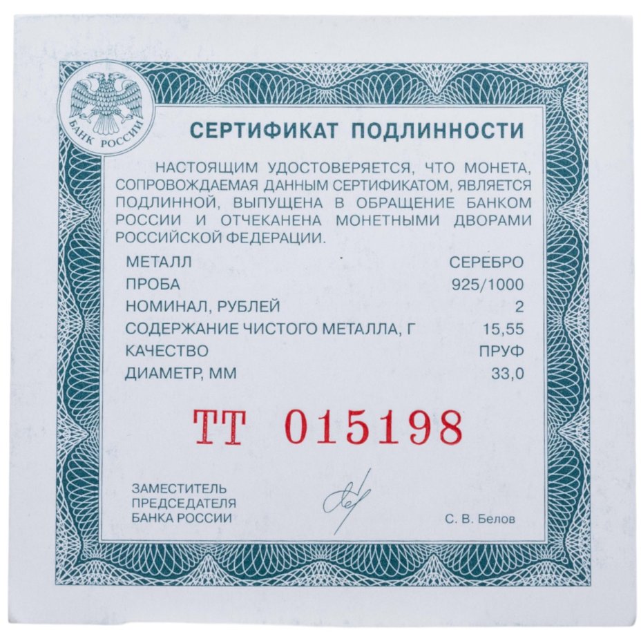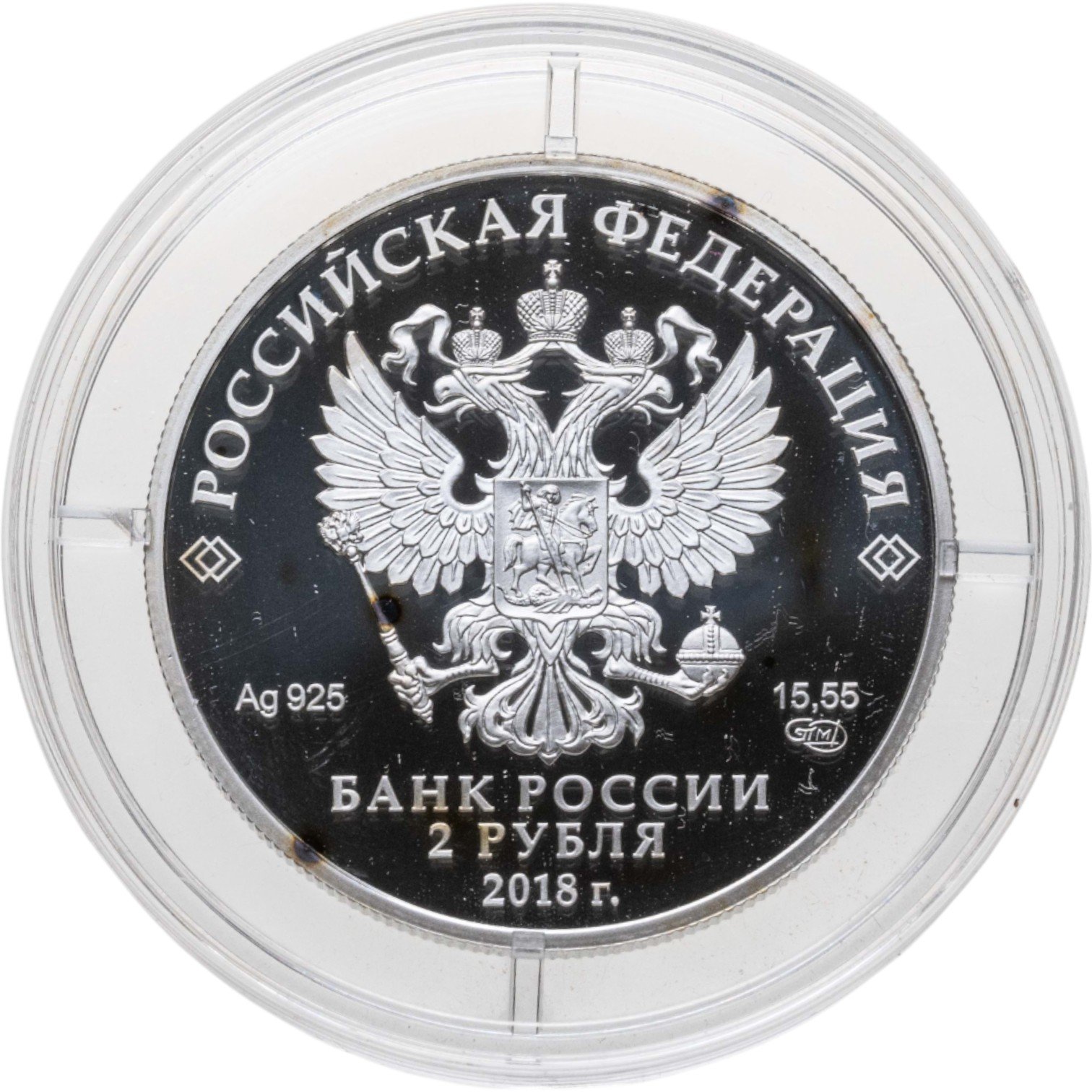 На зеркальном поле диска расположено рельефное изображение Государственного герба Российской Федерации, над ним вдоль канта – надпись полукругом: "РОССИЙСКАЯ ФЕДЕРАЦИЯ", обрамленная с обеих сторон сдвоенными ромбами, внизу под гербом: слева – обозначения драгоценного металла и пробы сплава, справа – содержание химически чистого металла и товарный знак монетного двора, внизу в центре – надпись в три строки: "БАНК РОССИИ", номинал монеты: "2 РУБЛЯ", год выпуска: "2018 г.".