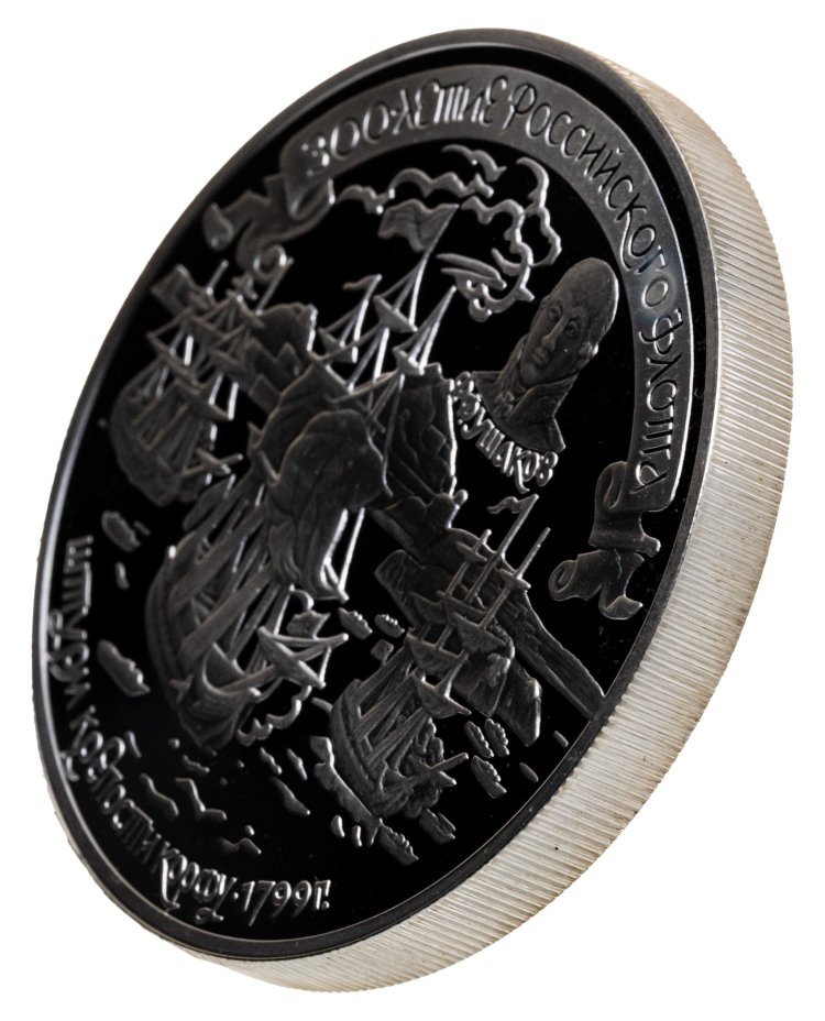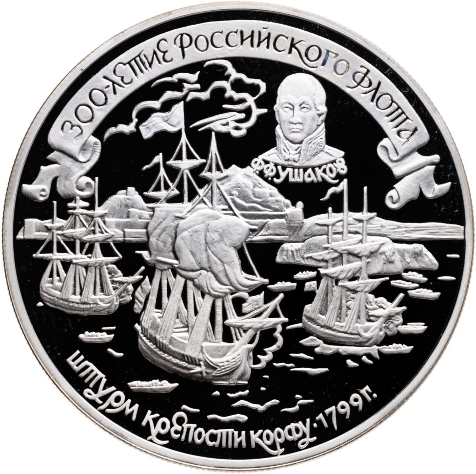 Изображения парусных судов в момент штурма крепости Корфу, слева над ними - портрет адмирала Ф.Ф. Ушакова, под ним полукругом надпись: "Ф.Ф. УШАКОВ", по окружности - надписи: вверху на ленте - "300-ЛЕТИЕ РОССИЙСКОГО ФЛОТА", внизу - "ШТУРМ КРЕПОСТИ КОРФУ. 1799 Г.".