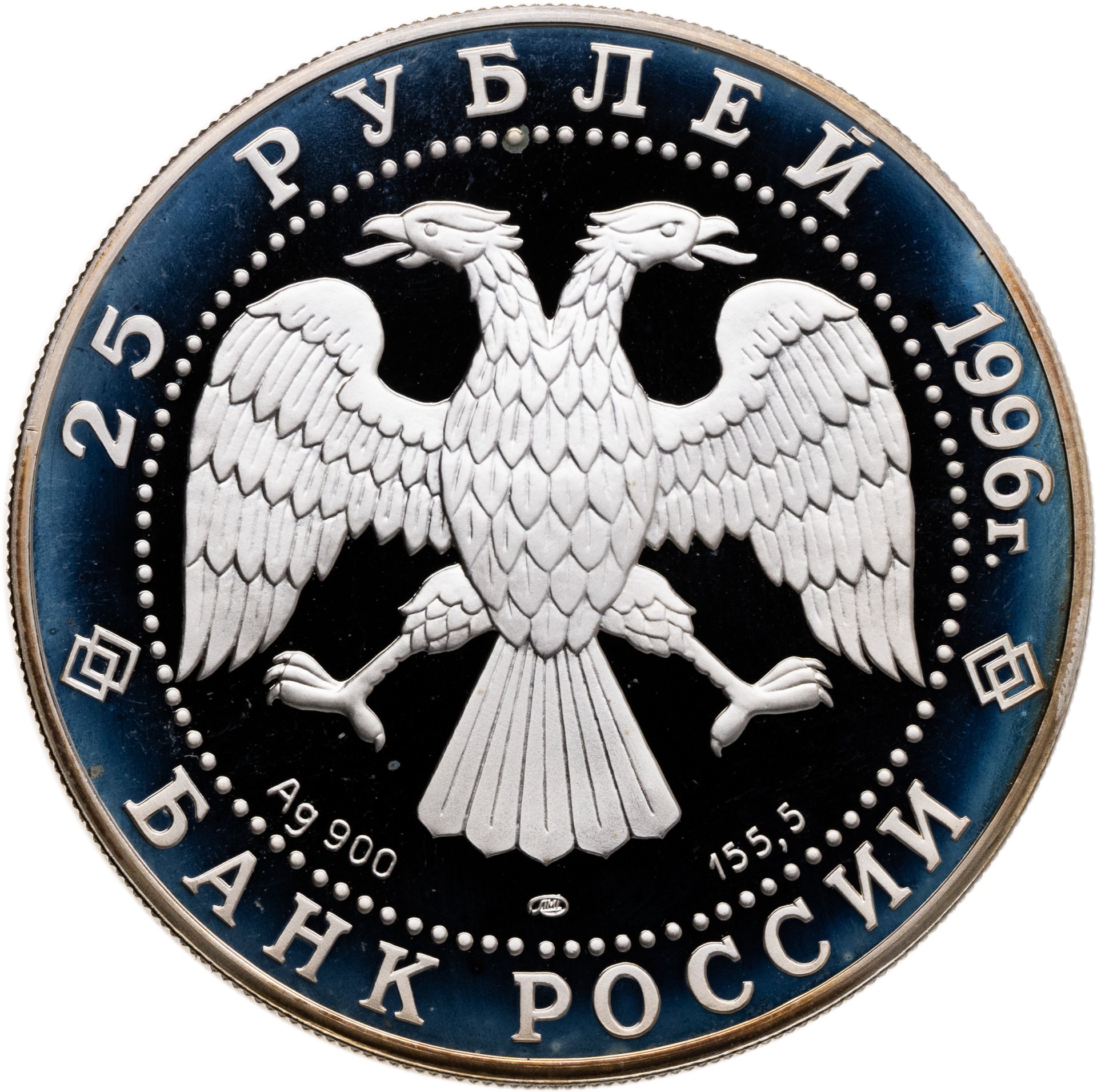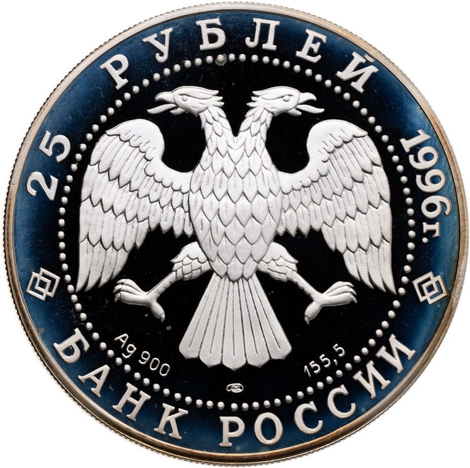 Вверху вдоль канта номинал «25 рублей» и год выпуска «1996 г.», внизу слова «БАНК РОССИИ». В середине в ободке из точек двуглавый орел под ним с внутренней стороны точечного ободка слева химическое название «Ag» и проба «900» металла, далее направо монограмма монетного двора «ЛМД» и чистый вес находящегося в монете драгоценного металла «155,50».