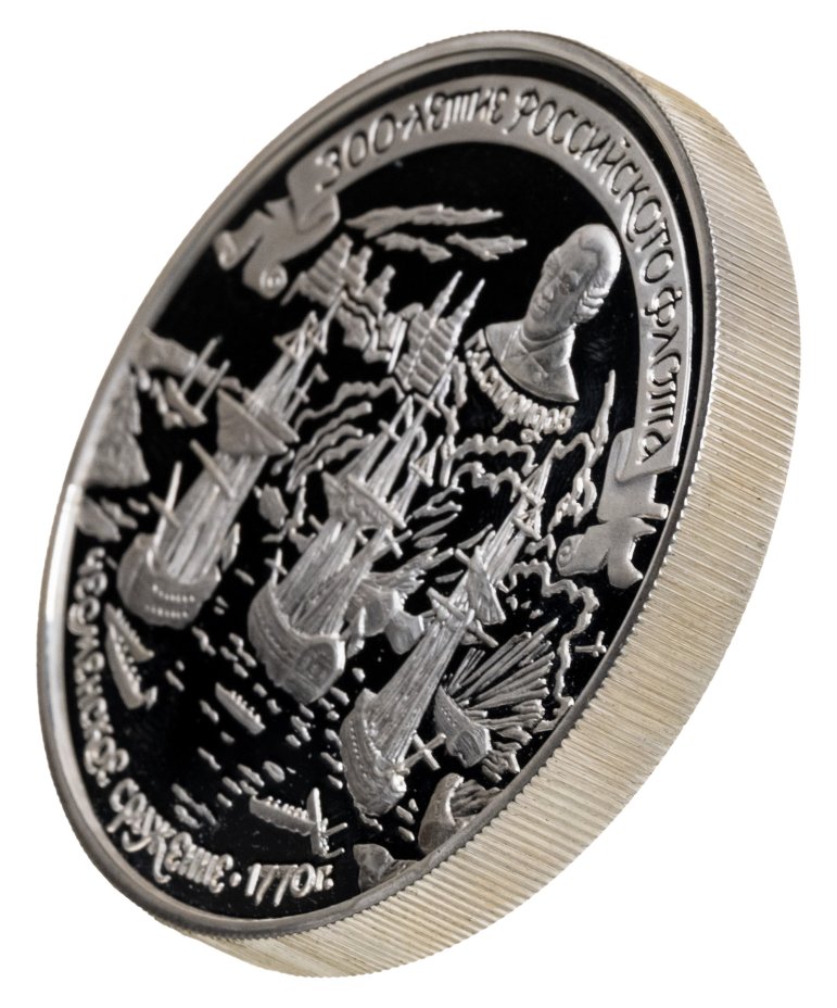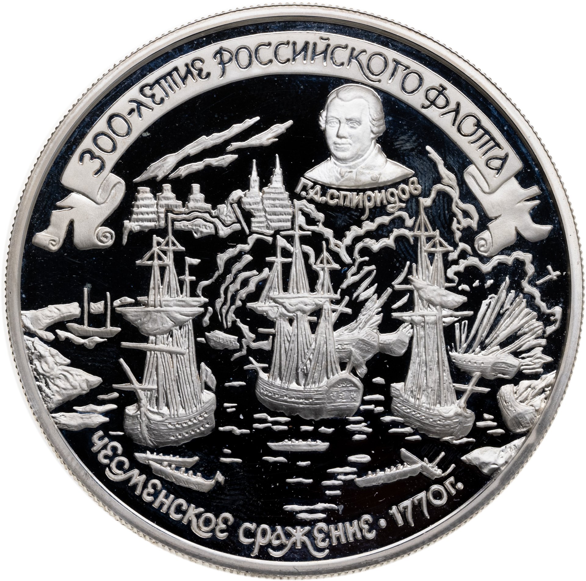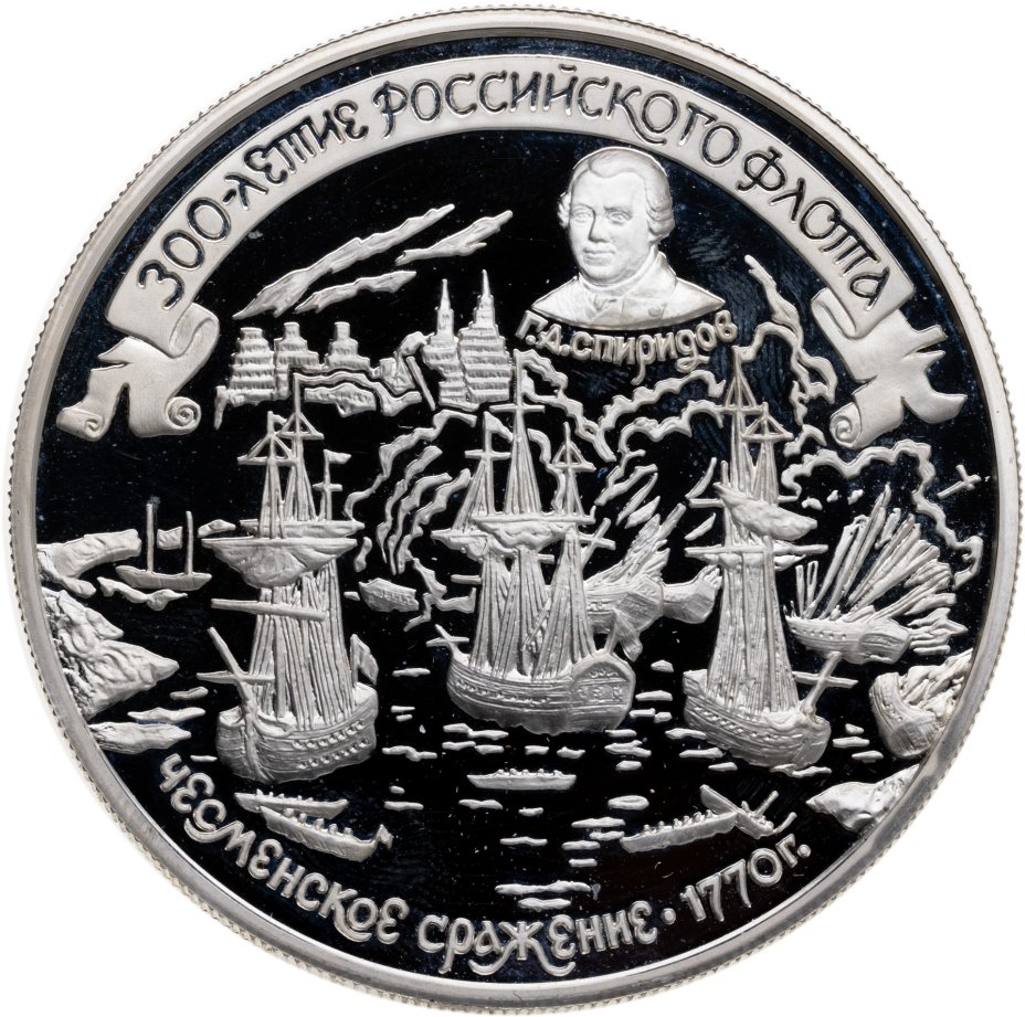 Изображения парусных судов в момент Чесменского сражения, слева над ними - портрет адмирала Г.А. Спиридова, под ним полукругом надпись: "Г.А. СПИРИДОВ", по окружности - надписи: вверху на ленте - "300-ЛЕТИЕ РОССИЙСКОГО ФЛОТА", внизу - "ЧЕСМЕНСКОЕ СРАЖЕНИЕ.1770 Г.".