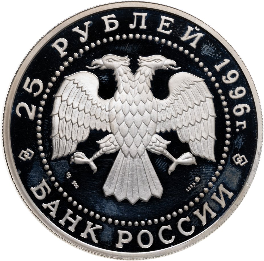 Вверху вдоль канта номинал «25 рублей» и год выпуска «1996 г.», внизу слова «БАНК РОССИИ». В середине в ободке из точек двуглавый орел под ним с внутренней стороны точечного ободка слева химическое название «Ag» и проба «900» металла, далее направо монограмма монетного двора «ММД» и чистый вес находящегося в монете драгоценного металла «155,50».