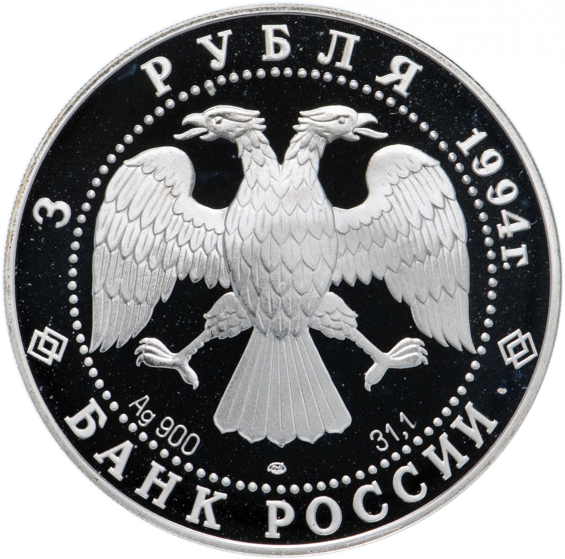Вверху вдоль канта номинал «3 рубля» и год выпуска «1994 г.», внизу слова «БАНК РОССИИ». В середине в ободке из точек двуглавый орел под ним с внутренней стороны точечного ободка слева химическое название «Ag» и проба «900» металла, далее направо монограмма монетного двора «ЛМД» и чистый вес находящегося в монете драгоценного металла «31,10».