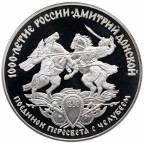 3 рубля 1996 ЛМД "Дмитрий Донской.Поединок Пересвета с Челубеем"