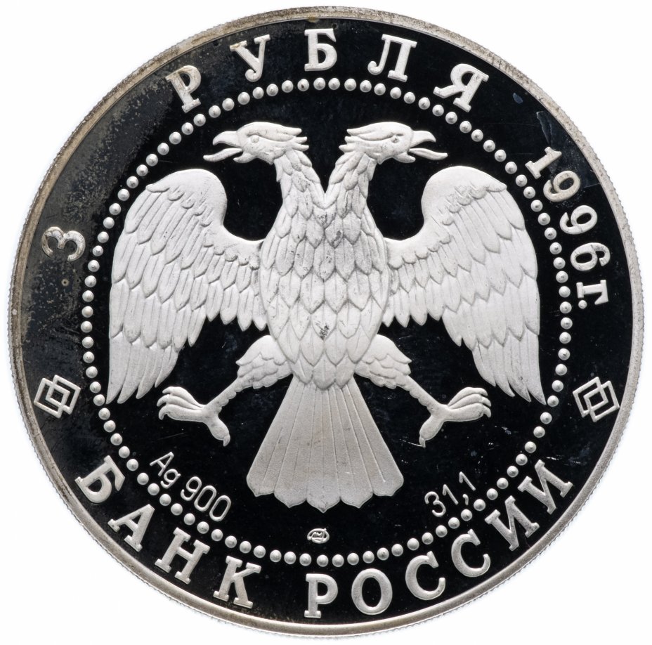 Вверху вдоль канта номинал «3 рубля» и год выпуска «1996 г.», внизу слова «БАНК РОССИИ». В середине в ободке из точек двуглавый орел под ним с внутренней стороны точечного ободка слева химическое название «Ag» и проба «900» металла, далее направо монограмма монетного двора «ЛМД» и чистый вес находящегося в монете драгоценного металла «31,10».