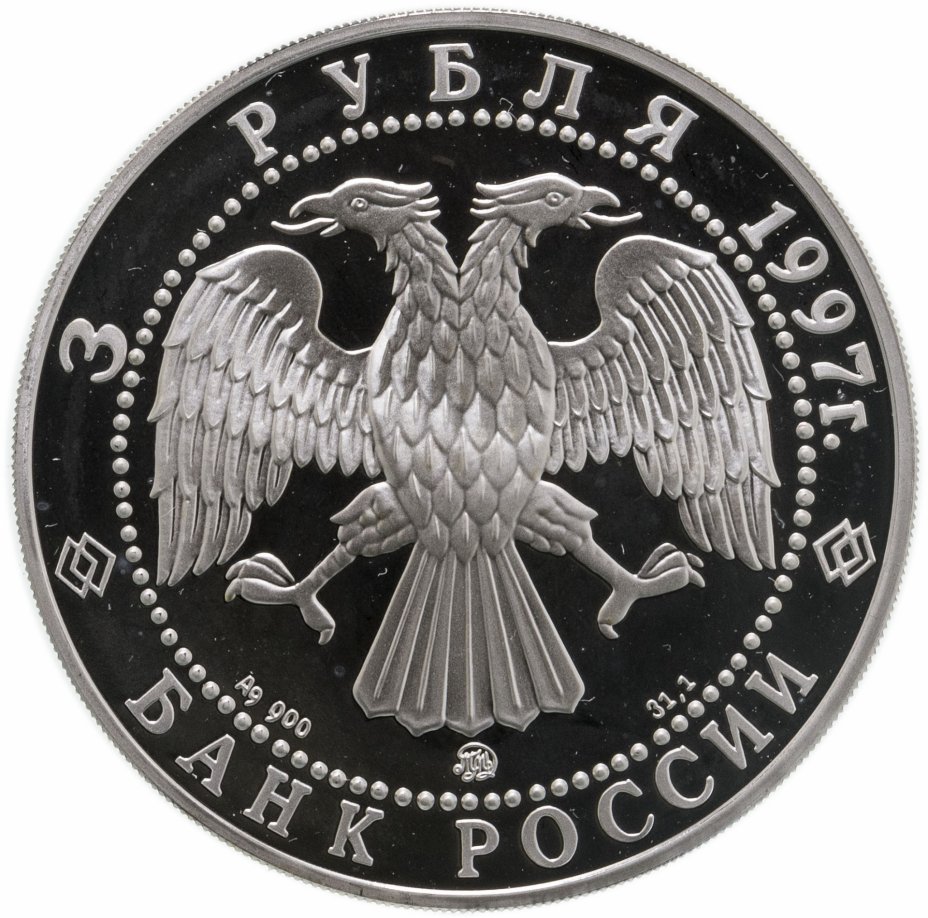 Вверху вдоль канта номинал «3 рубля» и год выпуска «1997 г.», внизу слова «БАНК РОССИИ». В середине в ободке из точек двуглавый орел под ним с внутренней стороны точечного ободка слева химическое название «Ag» и проба «900» металла, далее направо монограмма монетного двора «ММД» и чистый вес находящегося в монете драгоценного металла «31,10».