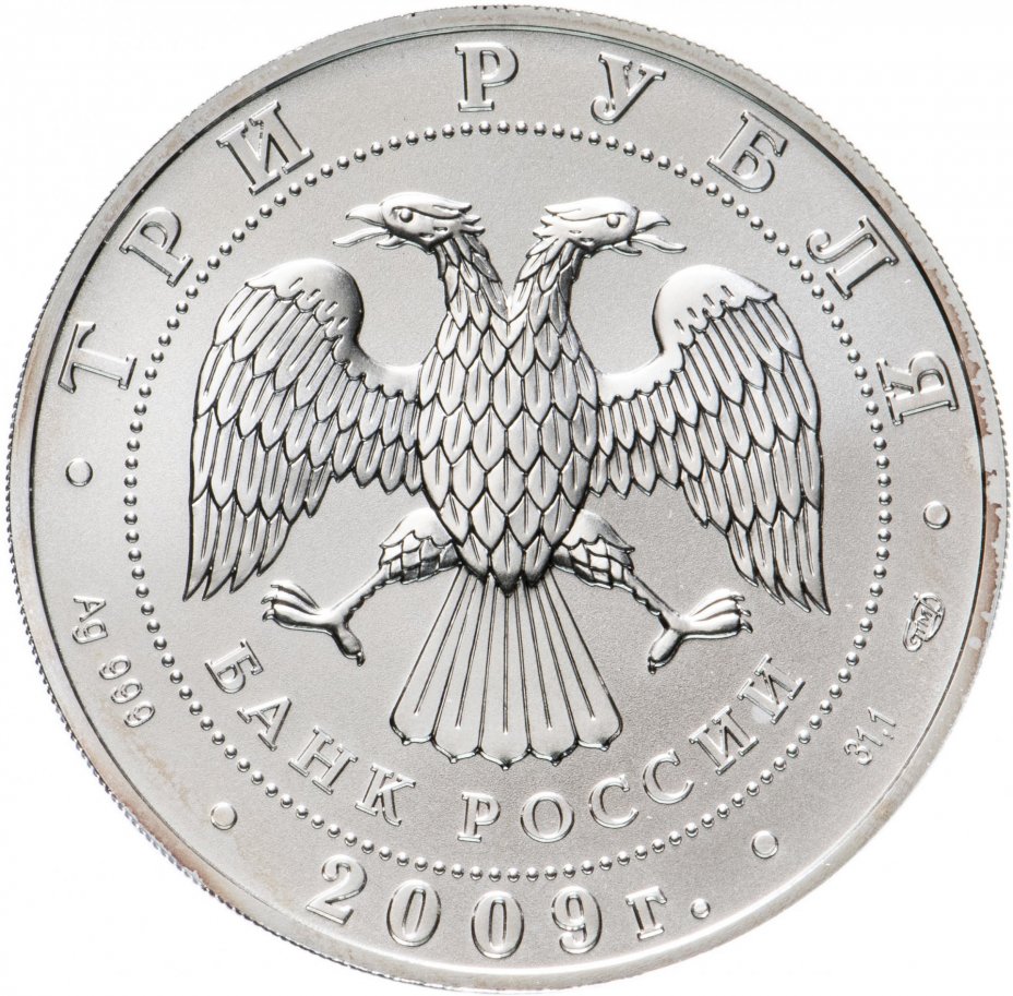 Вверху вдоль канта номинал «ТРИ РУБЛЯ», внизу слева химическое название «Ag» и проба «999» металла, внизу по центру год выпуска «2009 г.», внизу справа чистый вес находящегося в монете драгоценного металла «31,10» и монограмма монетного двора «СПМД». В середине в ободке из точек двуглавый орел под ним с внутренней стороны точечного ободка слова «БАНК РОССИИ».