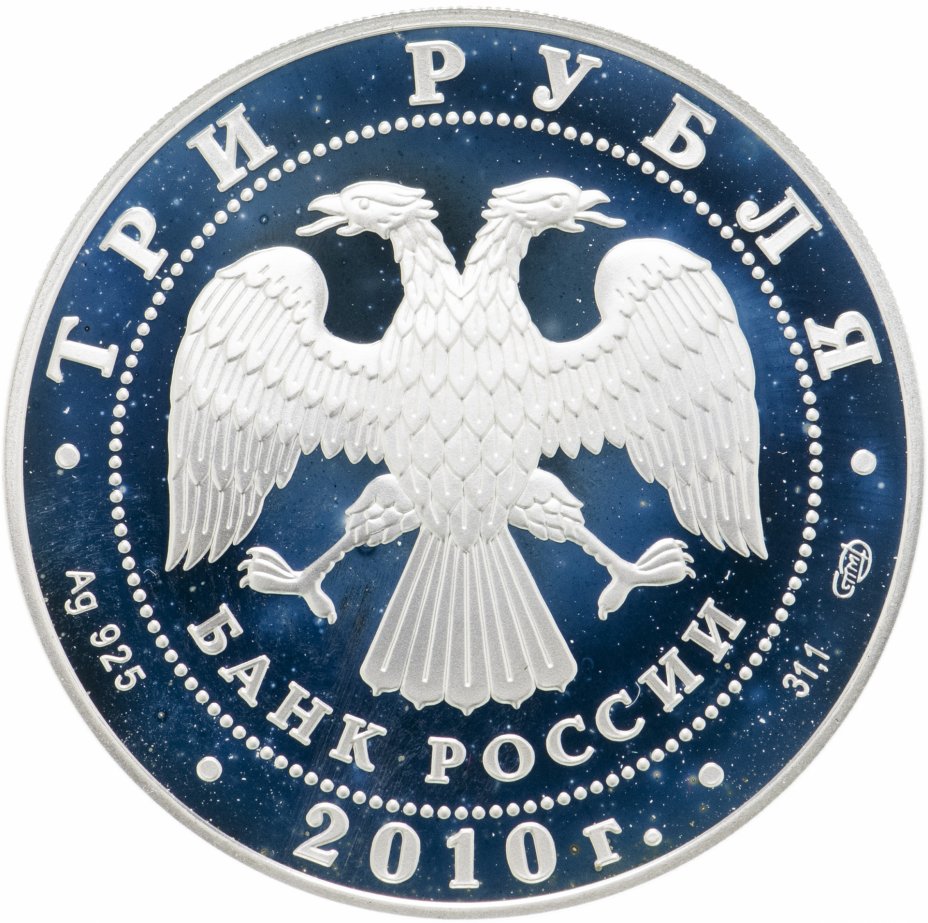 Вверху вдоль канта номинал «ТРИ РУБЛЯ», внизу слева химическое название «Ag» и проба «925» металла, внизу по центру год выпуска «2010 г.», внизу справа чистый вес находящегося в монете драгоценного металла «31,10» и монограмма монетного двора «СПМД». В середине в ободке из точек двуглавый орел под ним с внутренней стороны точечного ободка слова «БАНК РОССИИ».