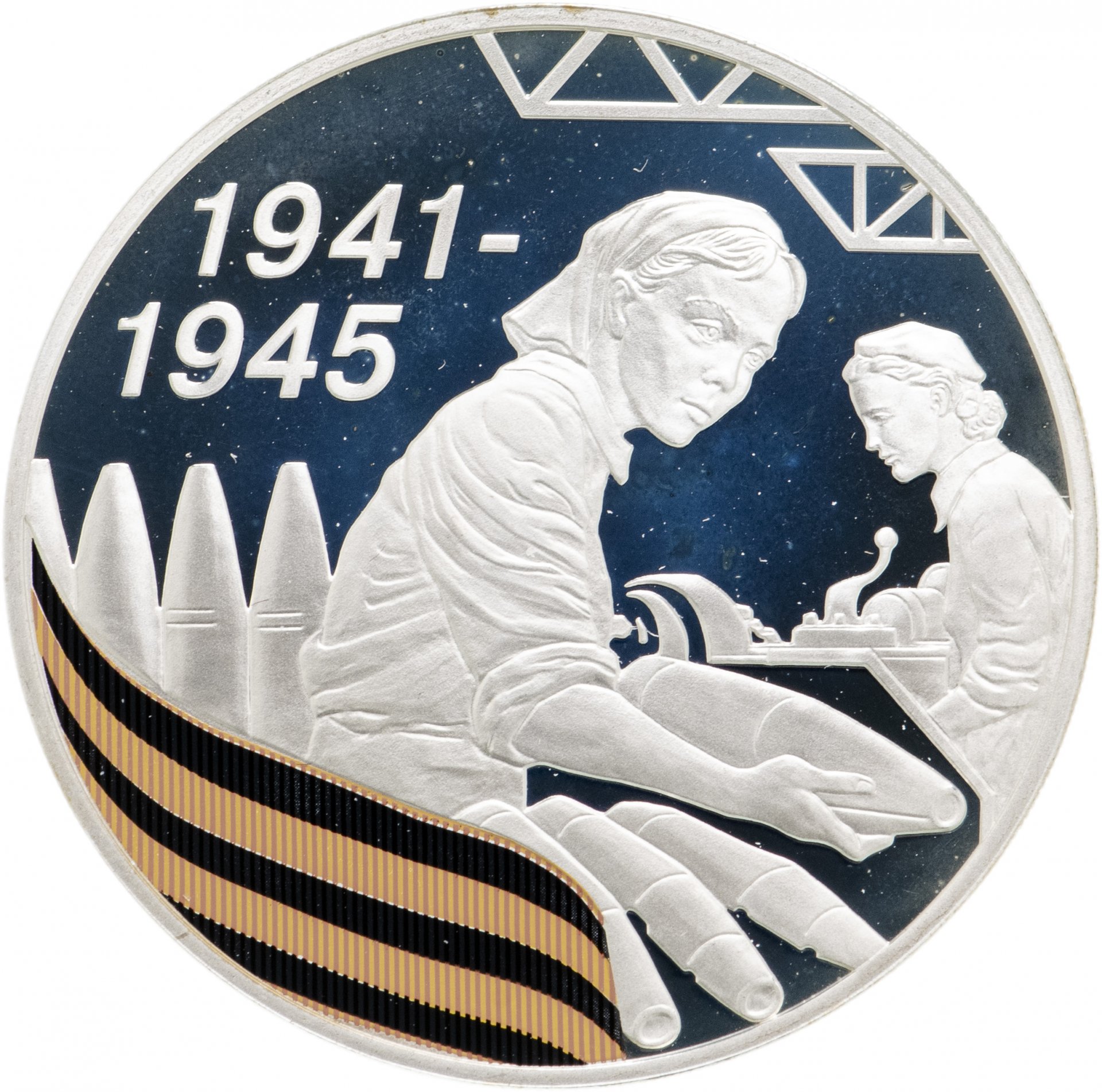 На первом плане в центре - женщина, укладывающая снаряды, слева в две строки - даты "1941-1945", - на втором плане справа - женщина, работающая за станком, внизу - цветное изображение орденской ленты.