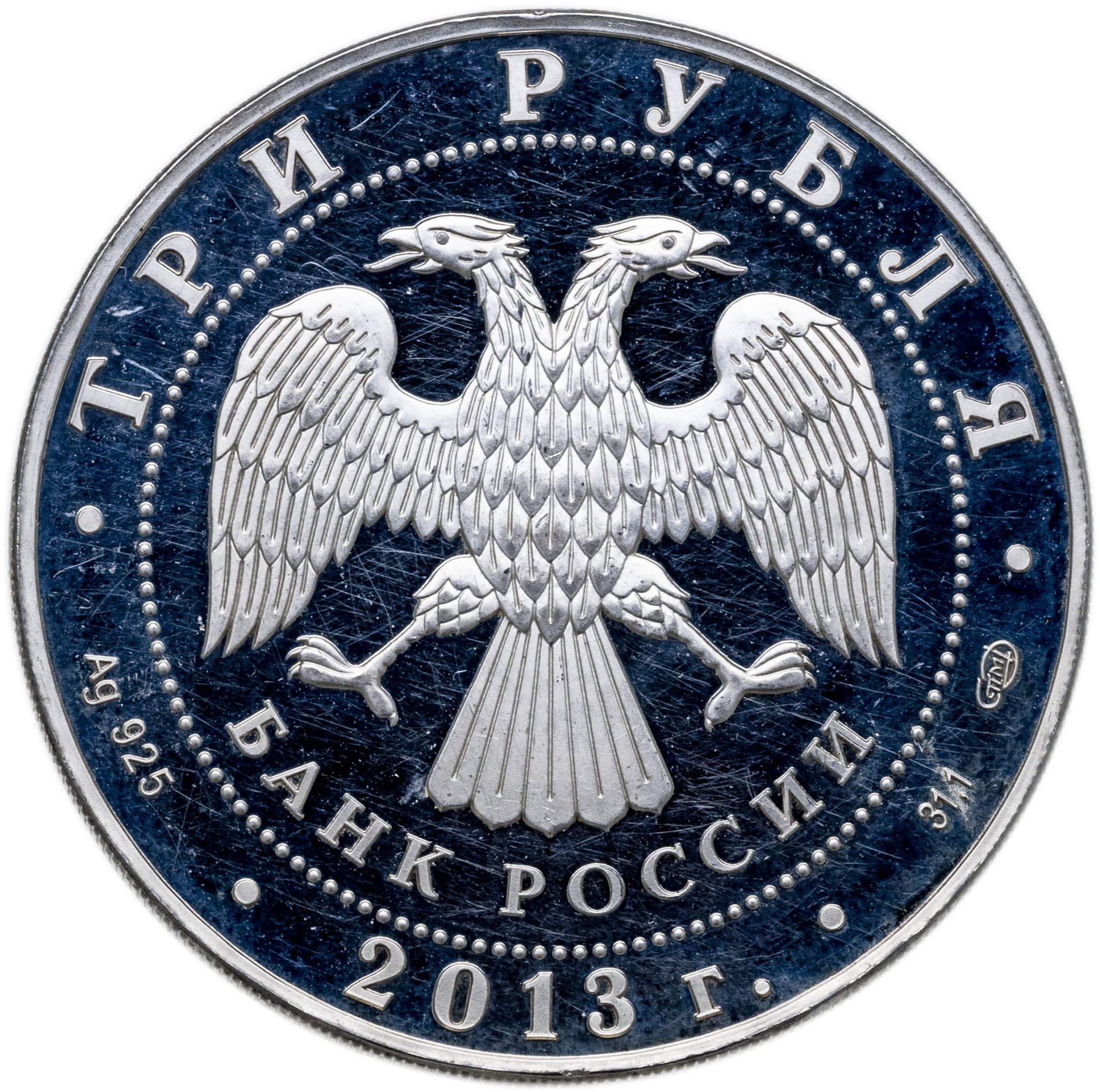 Вверху вдоль канта номинал «ТРИ РУБЛЯ», внизу слева химическое название «Ag» и проба «925» металла, внизу по центру год выпуска «2013 г.», внизу справа чистый вес находящегося в монете драгоценного металла «31,10» и монограмма монетного двора «СПМД». В середине в ободке из точек двуглавый орел под ним с внутренней стороны точечного ободка слова «БАНК РОССИИ».