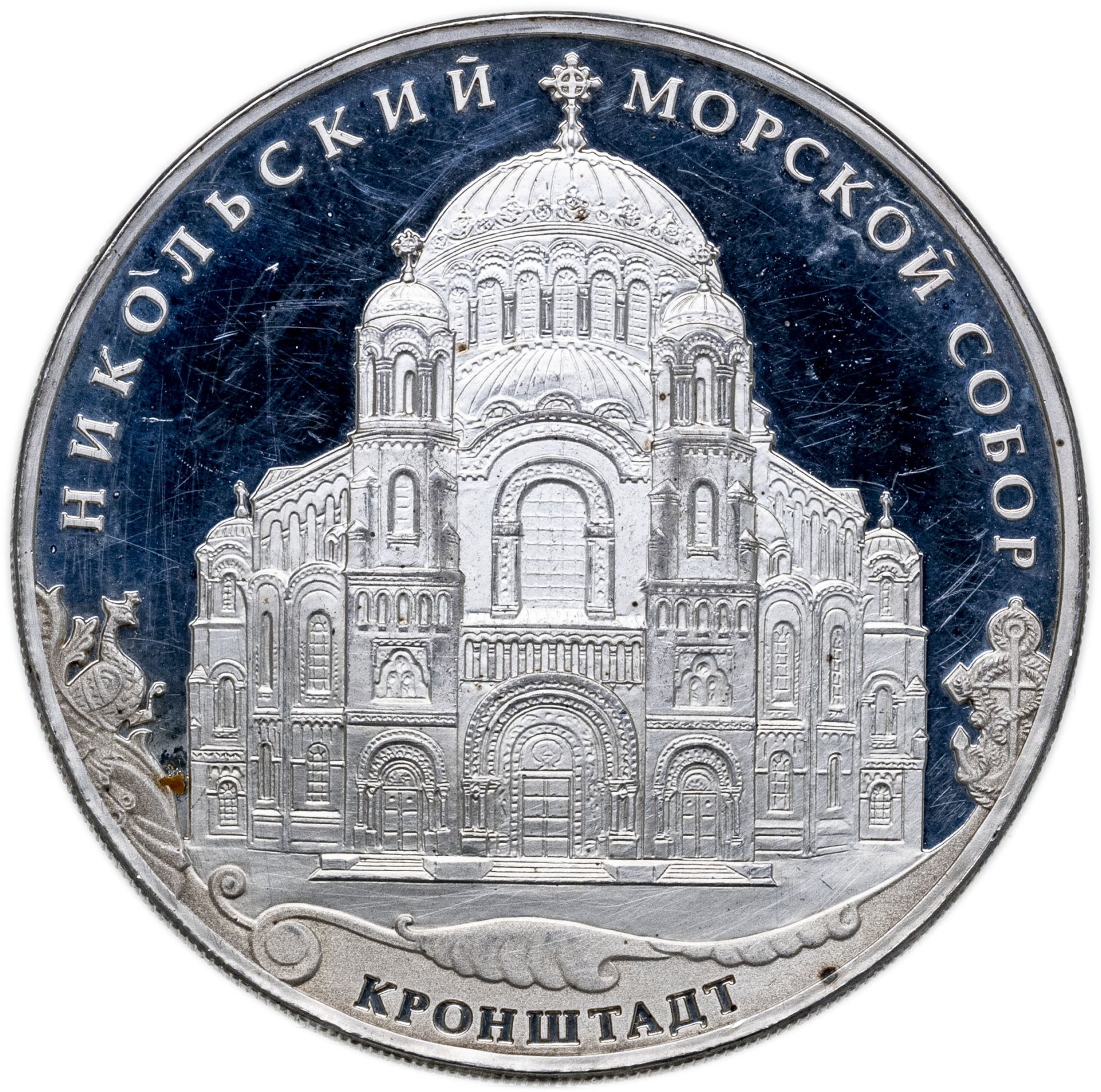 В центре диска на зеркальном поле – рельефное изображение храма, под ним на матовом поле – надпись вдоль канта: "КРОНШТАДТ", вверху вдоль канта – надпись полукругом: "НИКОЛЬСКИЙ МОРСКОЙ СОБОР".
