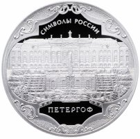В центре — рельефное изображение фасада Большого дворца и Большого каскада дворцово-паркового ансамбля Государственного музея-заповедника «Петергоф» (г. Петергоф), имеются надписи: вверху по окружности — «СИМВОЛЫ РОССИИ», внизу — «ПЕТЕРГОФ».