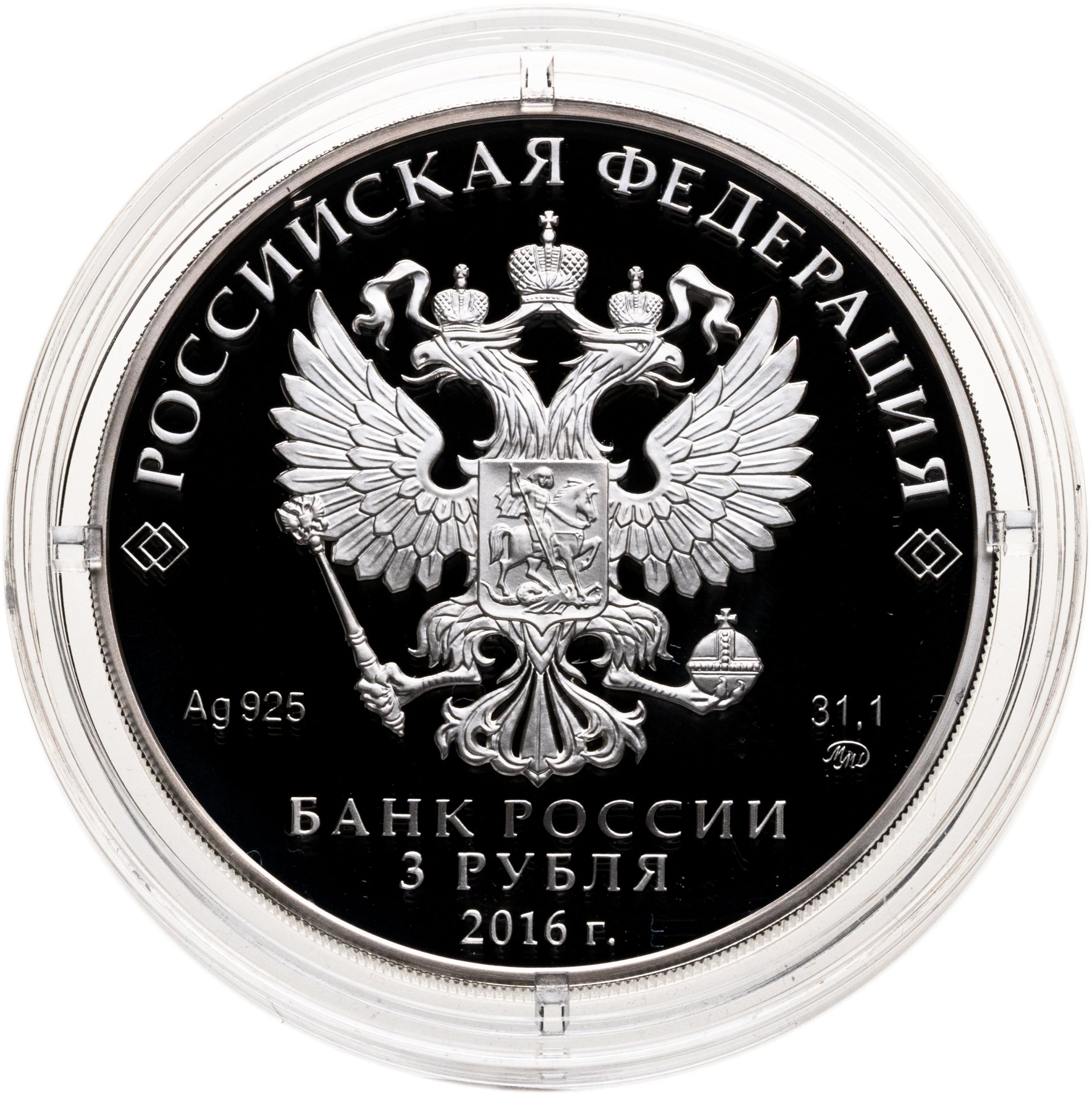 На зеркальном поле диска – рельефное изображение Государственного герба Российской Федерации, над ним вдоль канта – надпись полукругом: "РОССИЙСКАЯ ФЕДЕРАЦИЯ", обрамленная с обеих сторон сдвоенными ромбами, внизу под гербом: слева – обозначения драгоценного металла и пробы сплава, справа – содержание химически чистого металла и товарный знак монетного двора, внизу в центре в три строки – надпись: "БАНК РОССИИ", номинал монеты: "3 РУБЛЯ", год выпуска: "2016 г.".