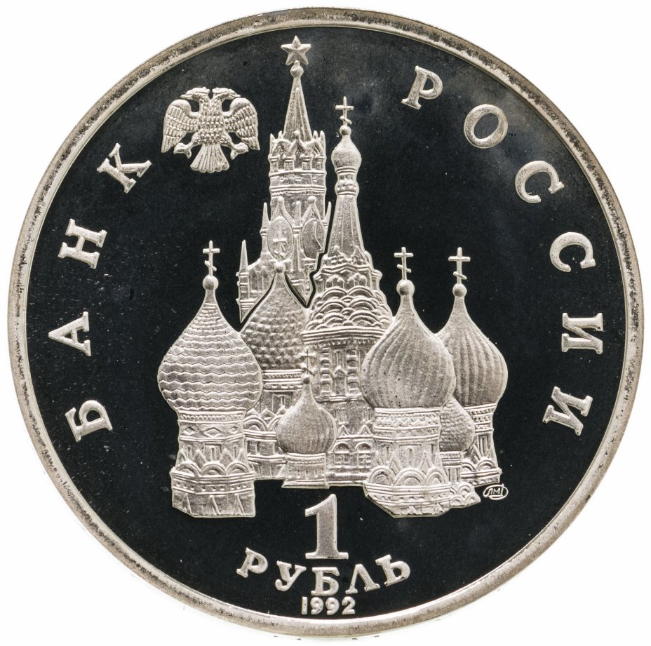 Сверху влево небольшое изображение двухглавого орла, слева слово «БАНК», справа «РОССИИ», внизу обозначение достоинства монеты - цифра «1» под ним слово «рубль», ниже год выпуска монеты «1992», в середине Собор Покрова Пресвятой Богородицы (собор Василия Блаженного) и за ним Спасская башня Московского Кремлля, чуть ниже и правее монограмма монетного двора «ЛМД».