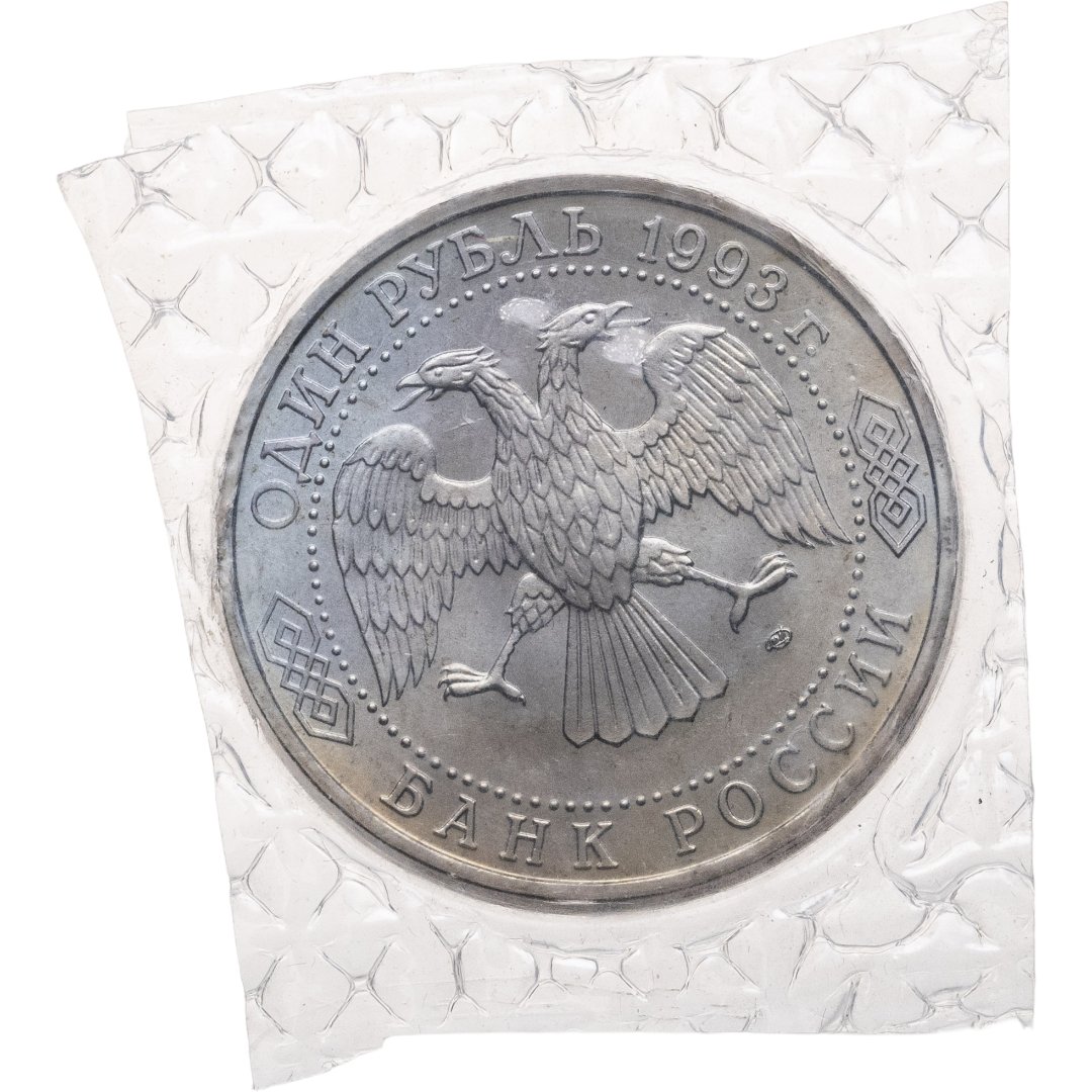 Вверху вдоль канта номинал «ОДИН РУБЛЬ» и год выпуска «1993 г.», внизу слова «БАНК РОССИИ». В середине двуглавый орел под ним справа монограмма монетного двора «ЛМД».