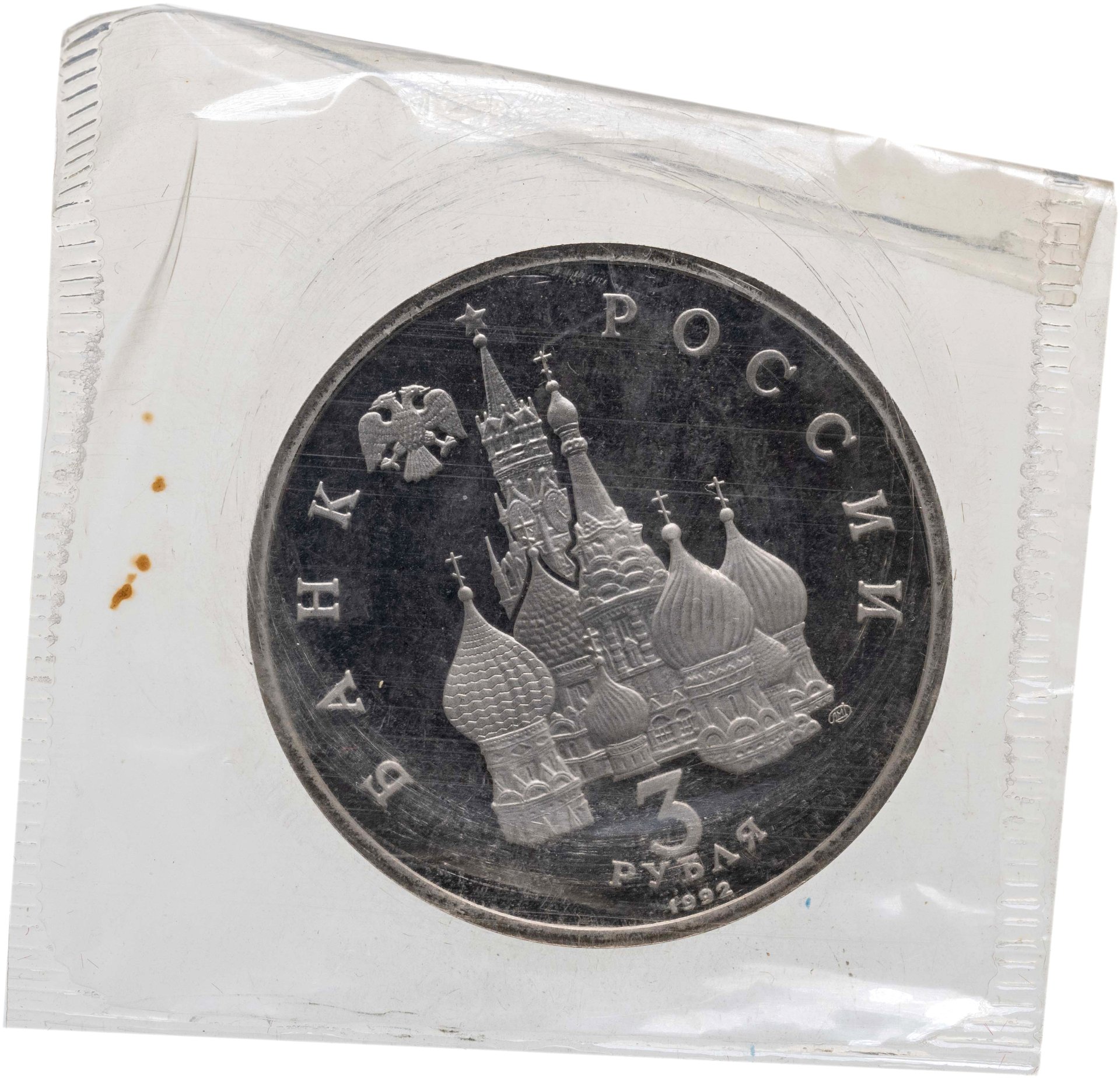 Сверху влево небольшое изображение двухглавого орла, слева слово «БАНК», справа «РОССИИ», внизу обозначение достоинства монеты - цифра «3» под ним слово «рубля», ниже год выпуска монеты «1992», в середине Собор Покрова Пресвятой Богородицы (собор Василия Блаженного) и за ним Спасская башня Московского Кремлля, чуть ниже и правее монограмма монетного двора «ЛМД».