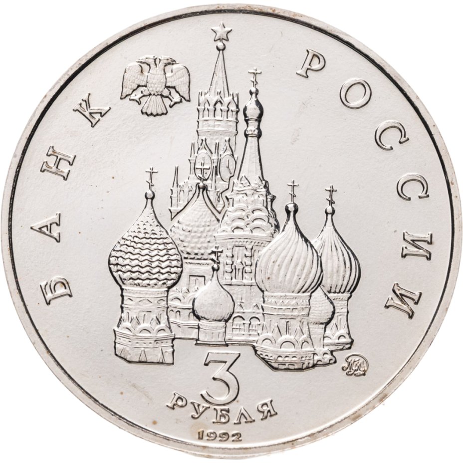 Сверху влево небольшое изображение двухглавого орла, слева слово «БАНК», справа «РОССИИ», внизу обозначение достоинства монеты - цифра «3» под ним слово «рубля», ниже год выпуска монеты «1992», в середине Собор Покрова Пресвятой Богородицы (собор Василия Блаженного) и за ним Спасская башня Московского Кремлля, чуть ниже и правее монограмма монетного двора «ММД».