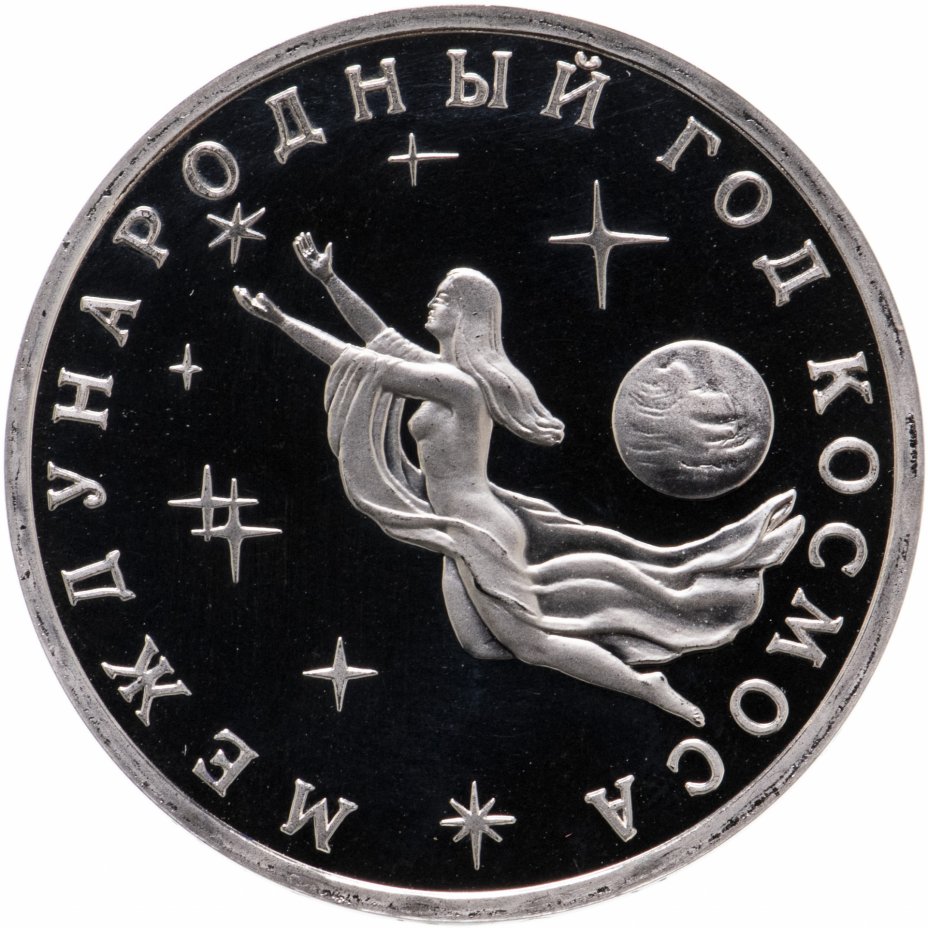 Символическое изображение созвездия Девы в виде летящей женщины на фоне звёздного неба, справа - изображение Земли, по окружности - надпись: "МЕЖДУНАРОДНЫЙ ГОД КОСМОСА", разделённая внизу звёздочкой.