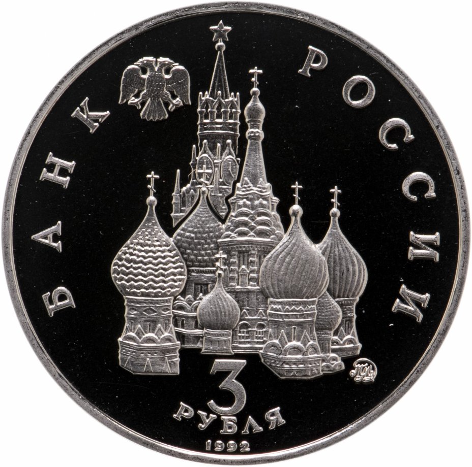 Сверху влево небольшое изображение двухглавого орла, слева слово «БАНК», справа «РОССИИ», внизу обозначение достоинства монеты - цифра «3» под ним слово «рубля», ниже год выпуска монеты «1992», в середине Собор Покрова Пресвятой Богородицы (собор Василия Блаженного) и за ним Спасская башня Московского Кремлля, чуть ниже и правее монограмма монетного двора «ММД».