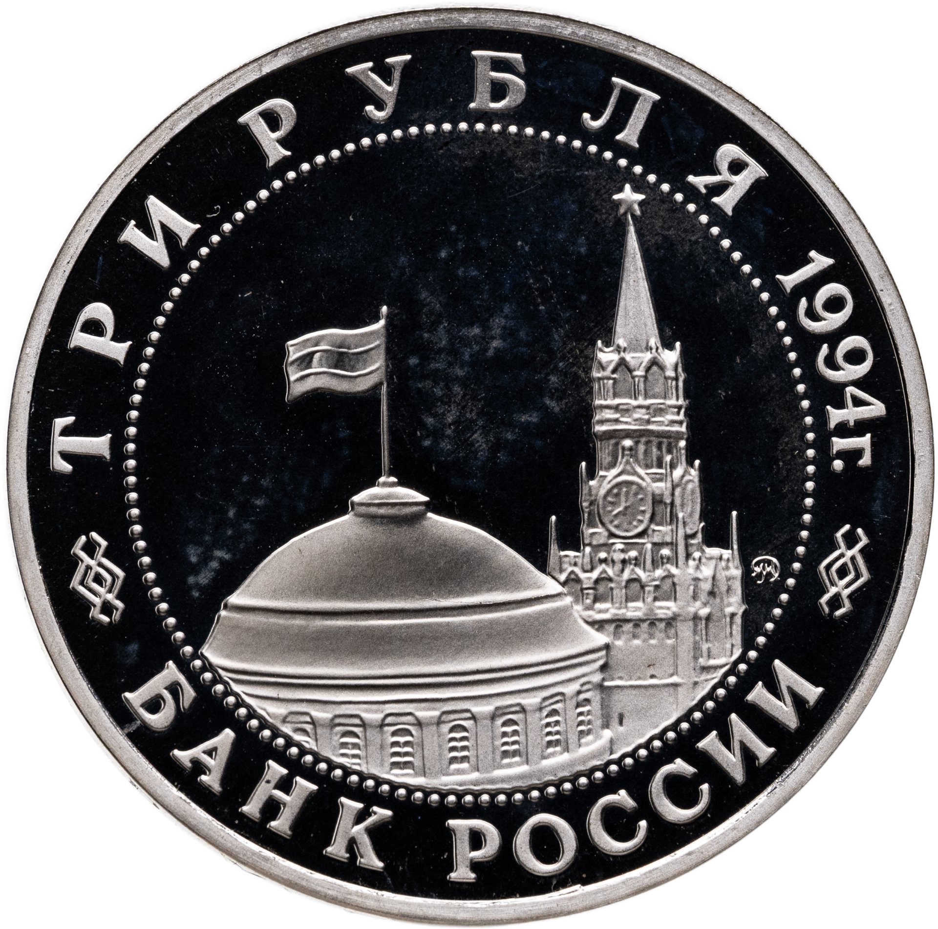 Вверху вдоль канта номинал «ТРИ РУБЛЯ» и год выпуска «1994 г.», внизу слова «БАНК РОССИИ». В середине в ободке из точек изображение Спасской башни Московского Кремля и частично перекрывающего ее купола Сенатского дворца с развевающимся флагом, с внутренней стороны точечного ободка справа монограмма монетного двора «ММД».