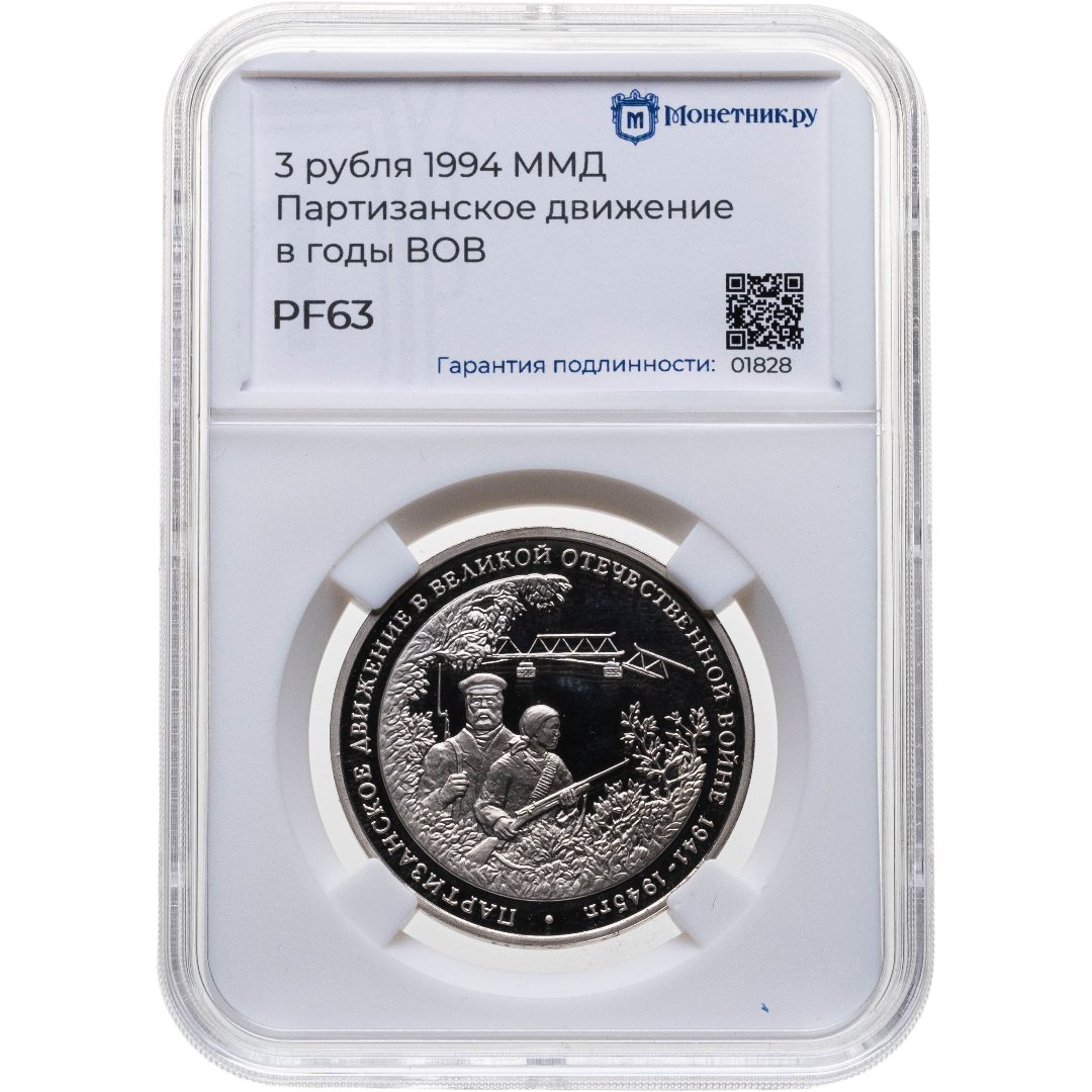 купить 3 рубля 1994 ММД Proof партизанское движение в Великой Отечественной войне, в слабе Монетник.ру PF63