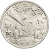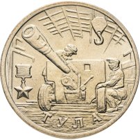13 городов в 1965-1985 годах были удостоены высшего воинского звания Город-Герой. К празднованию очередной, 55-й годовщины окончания Великой Отечественной войны, была выпущена серия памятных оборотных монет, посвящённая этим городам. Правда, в серию вошли лишь 7 монет – по числу городов, находящихся на тот момент в составе РФ: Ленинград, Сталинград, Москва, Новороссийск, Тула, Смоленск и Мурманск. В 2017, после присоединения Крыма, было выпущено ещё 2 монеты в этой серии: Керчь и Севастополь. На монете «Тула» – два оружейника у пушки.