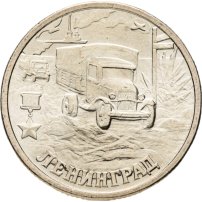На реверсе монеты – изображение грузовика, перевозившего из осажденного города людей, а в обратном направлении продовольствие. Это Дорога жизни, спасшая не одну сотню тысяч жителей Ленинграда. Справа – изображение медали «Золотая звезда», внизу по окружности – надпись «Ленинград».