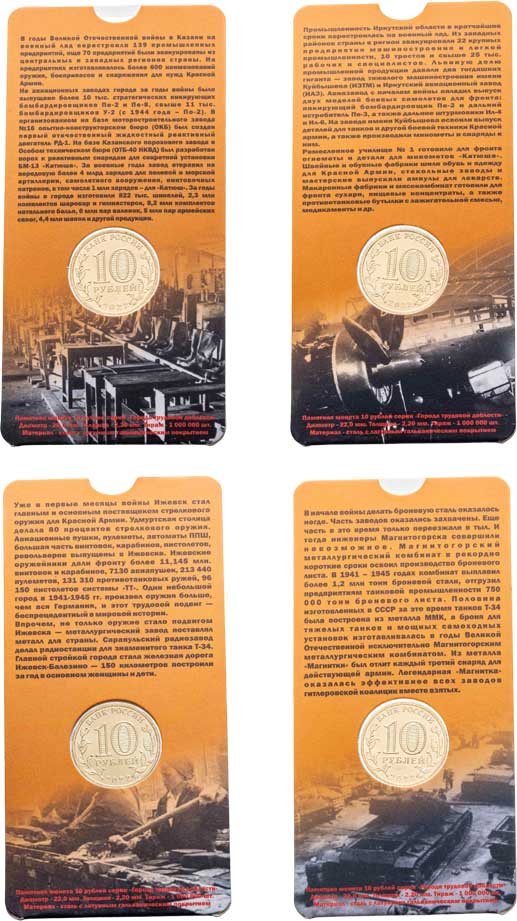 С 2021 года Банк России начинает выпуск монет «Города трудовой доблести», аналогичных завершившейся пять лет назад серии «Города воинской славы». Параметры новых юбилейных монет соответствуют типу стальных десятирублёвок, именуемому коллекционерами «ГВС» (вес 5,63 грамма при диаметре 22 мм и толщине 2,2 мм).