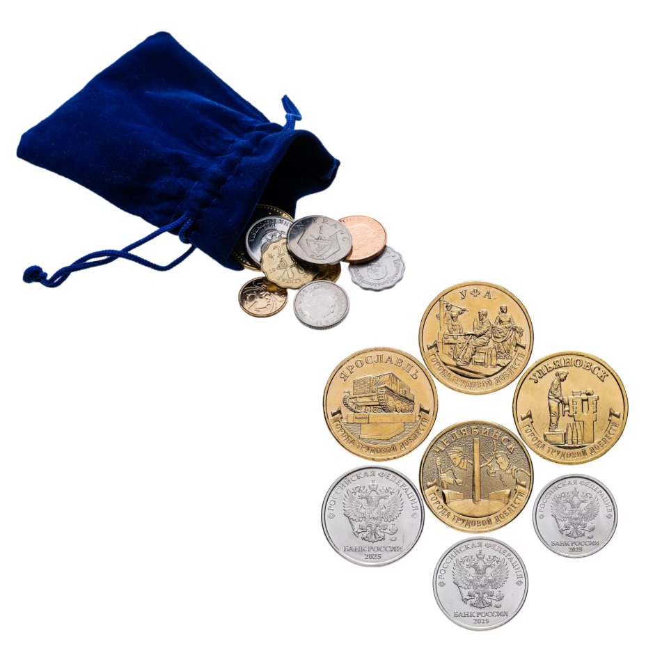 10 рублей Города трудовой доблести 4 шт (Ульяновск, Уфа, Челябинск, Ярославль)., оборотные монеты 3 шт. (1 рубль, 2 рубля, 3 рубля 2025)