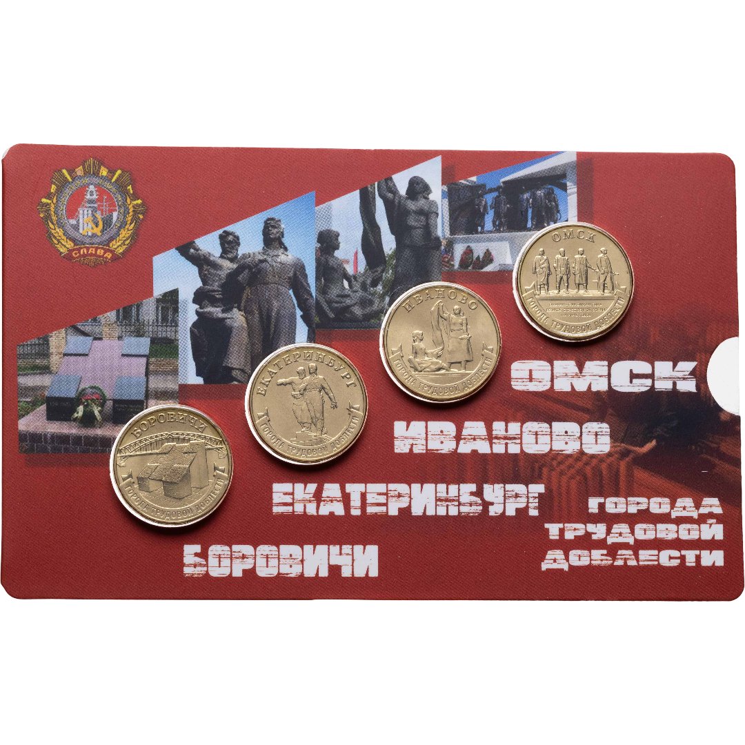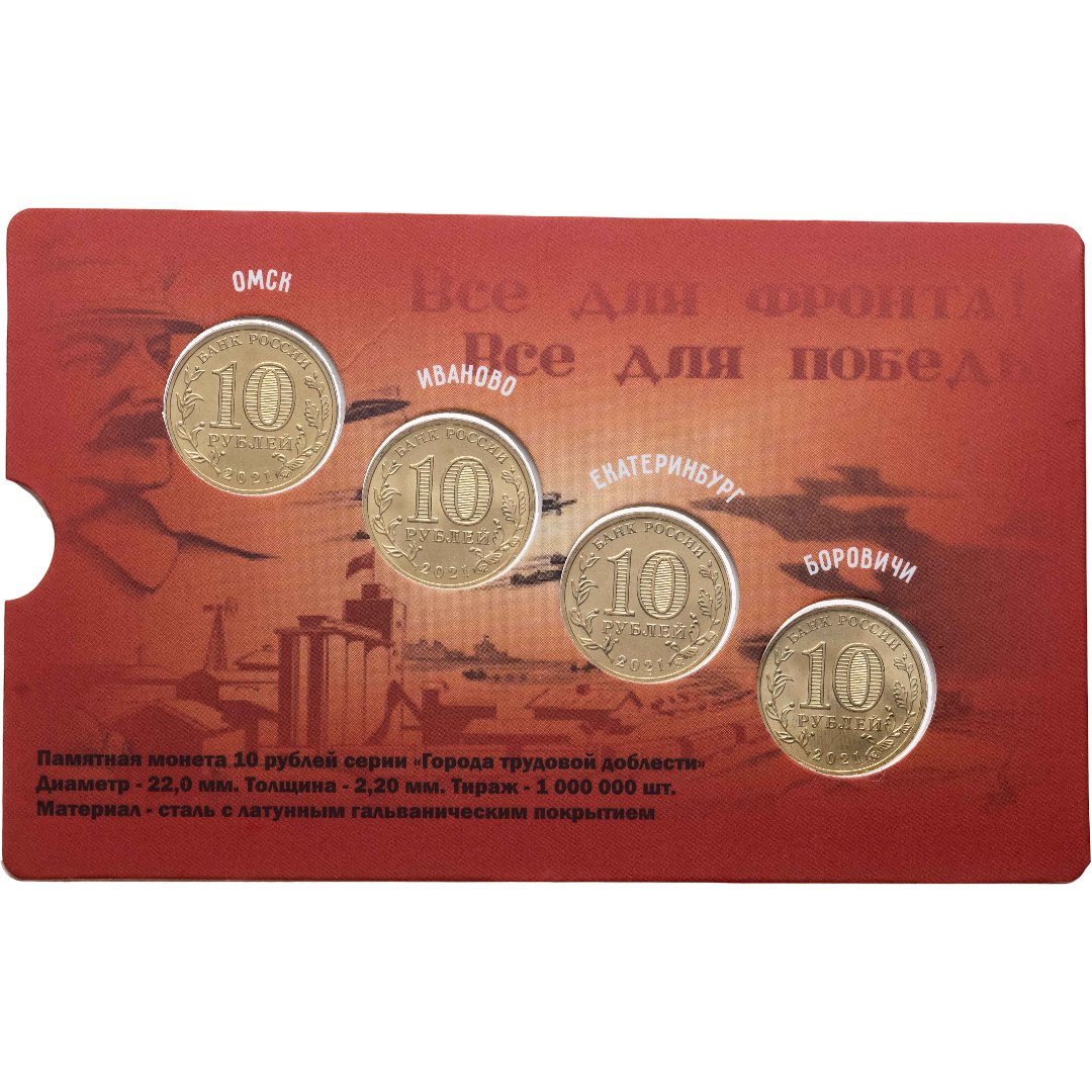Набор из 4-х монет 10 рублей 2021 Боровичи, Екатеринбург, Иваново, Омск (серия "Города Трудовой Доблести") в блистере