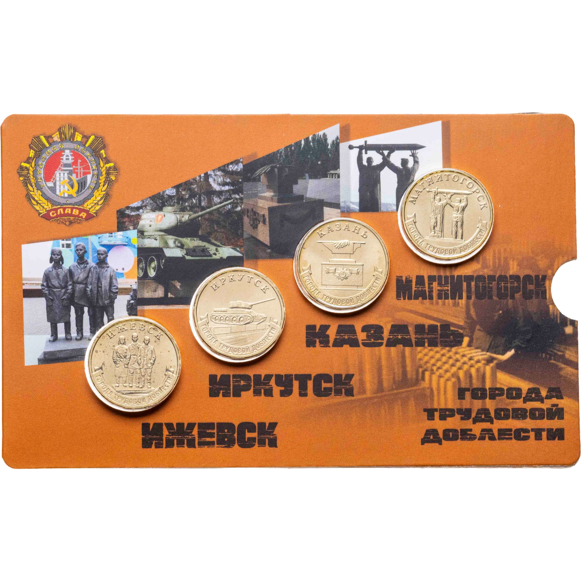 Набор из 4-х монет 10 рублей 2022 Иркутск, Ижевск, Казань, Магнитогорск (серия "Города Трудовой Доблести") в блистере