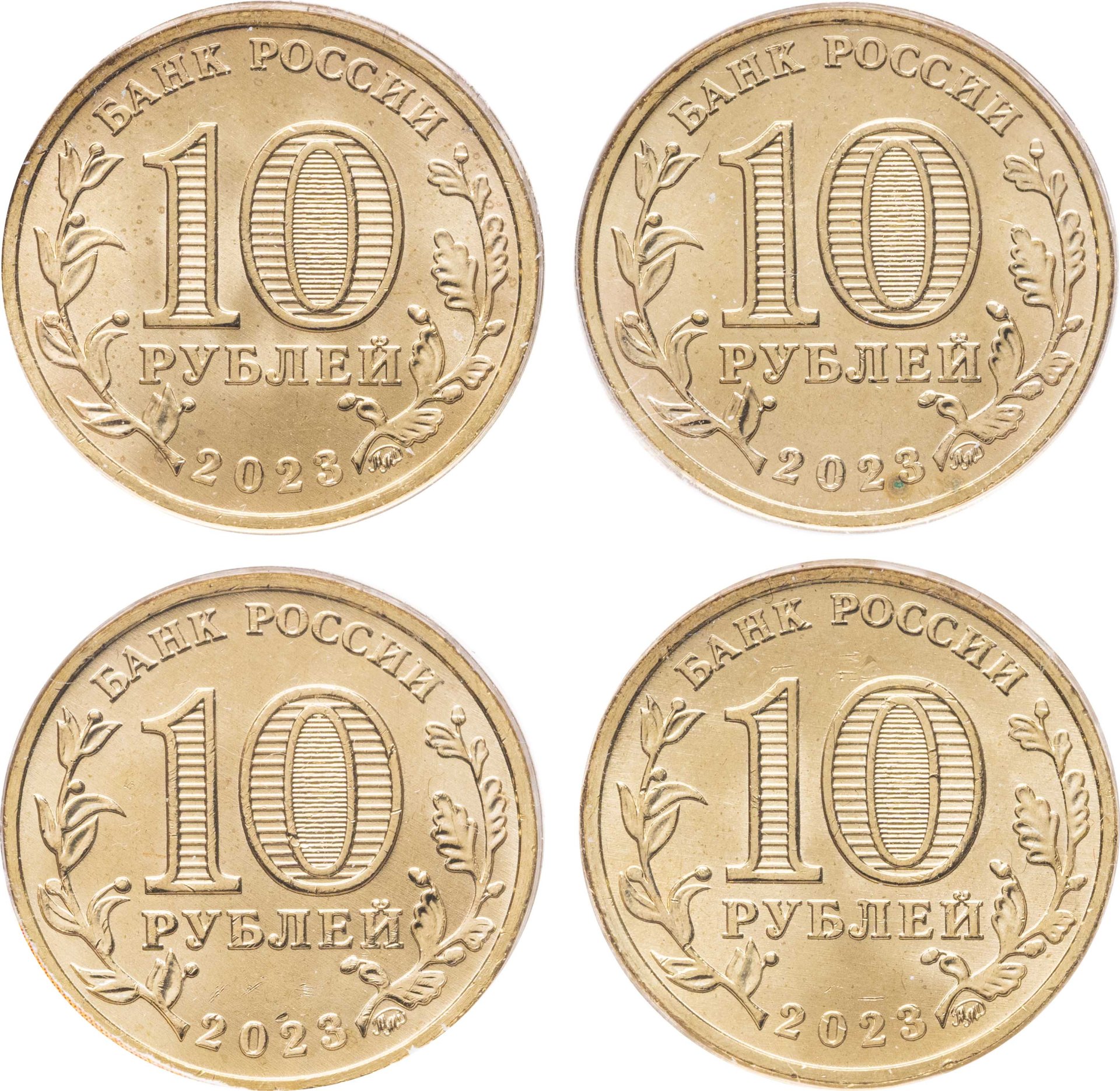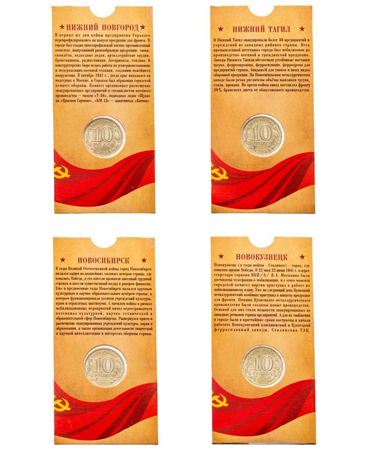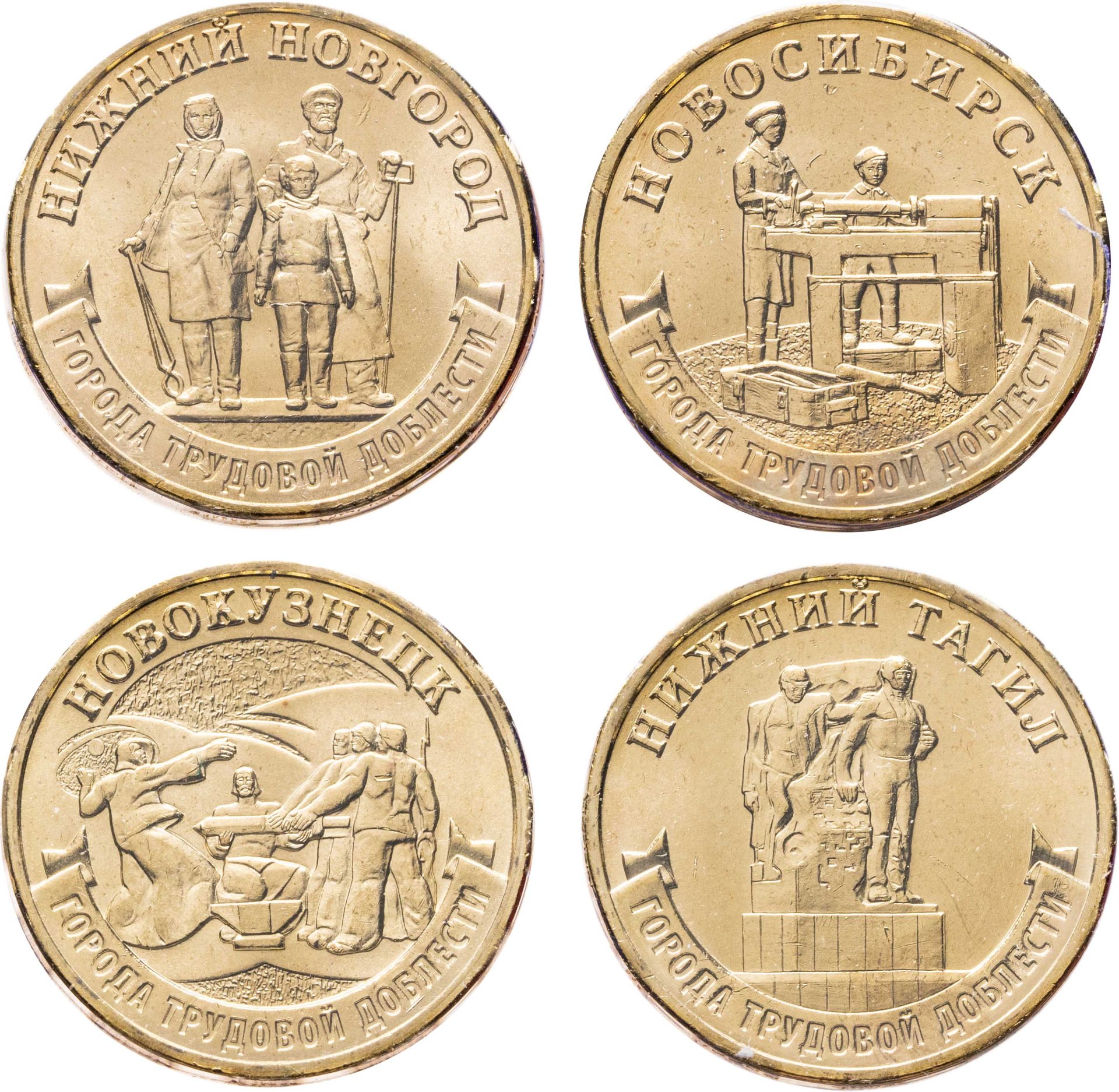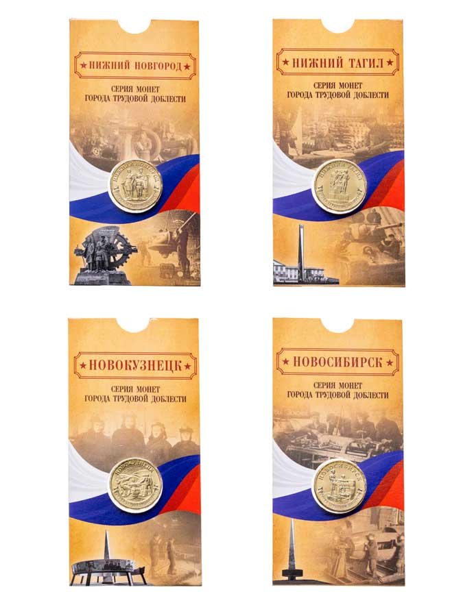 Набор из 4-х монет 10 рублей 2023 Нижний Новгород, Нижний Тагил, Новосибирск, Новокузнецк (серия "Города Трудовой Доблести") в блистерах
