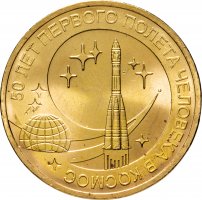10 рублей «50 лет первого полёта в космос» выпущены из стен Санкт-Петербургского монетного двора в 2011 году. Выпуск посвящён знаменательной дате прорыва человека в космос - юбилею полёта Ю.А. Гагарина. Напомним, что Гагарин на борту космического корабля «Восток», открыл землянам дорогу к звёздам 12 апреля 1961 года.