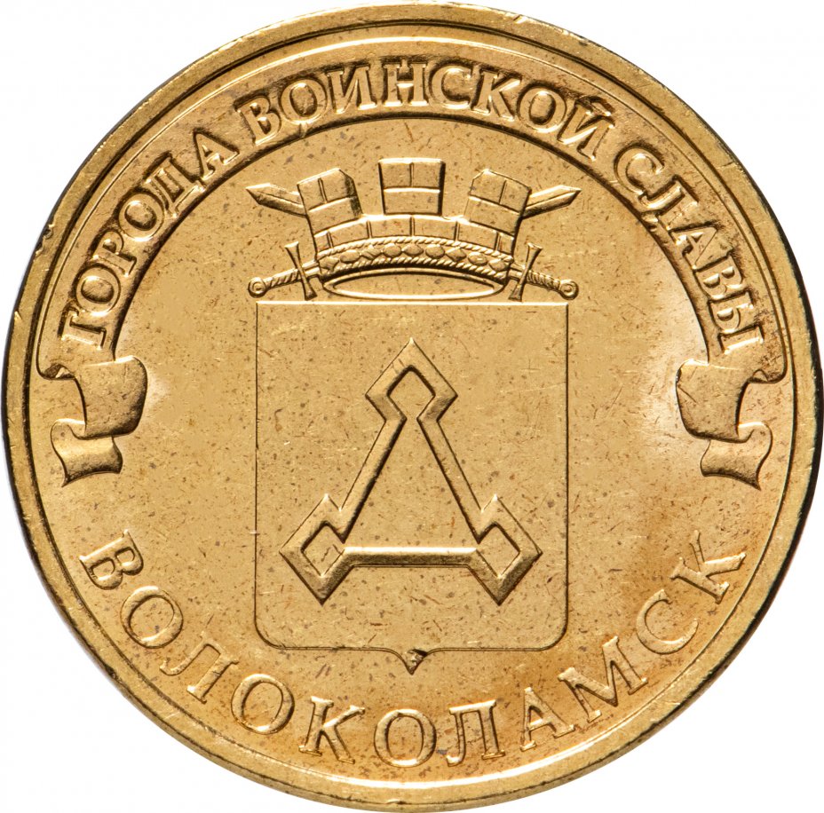 Реверс монеты - в центре изображён герб города Волоколамск. Он представляет собой прямоугольник с геометрическим узором по центру, над прямоугольником находится изображение башенной стены со скрещенными саблями. По верхней части монеты расположена надпись "Города воинской славы". По краю в нижней части монеты выбита надпись "Волоколамск".