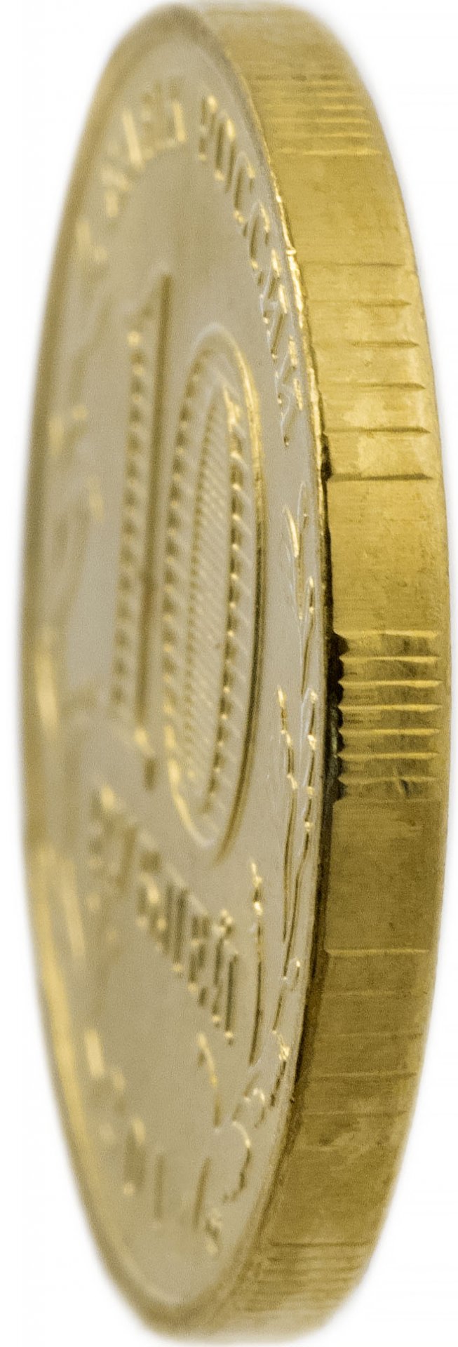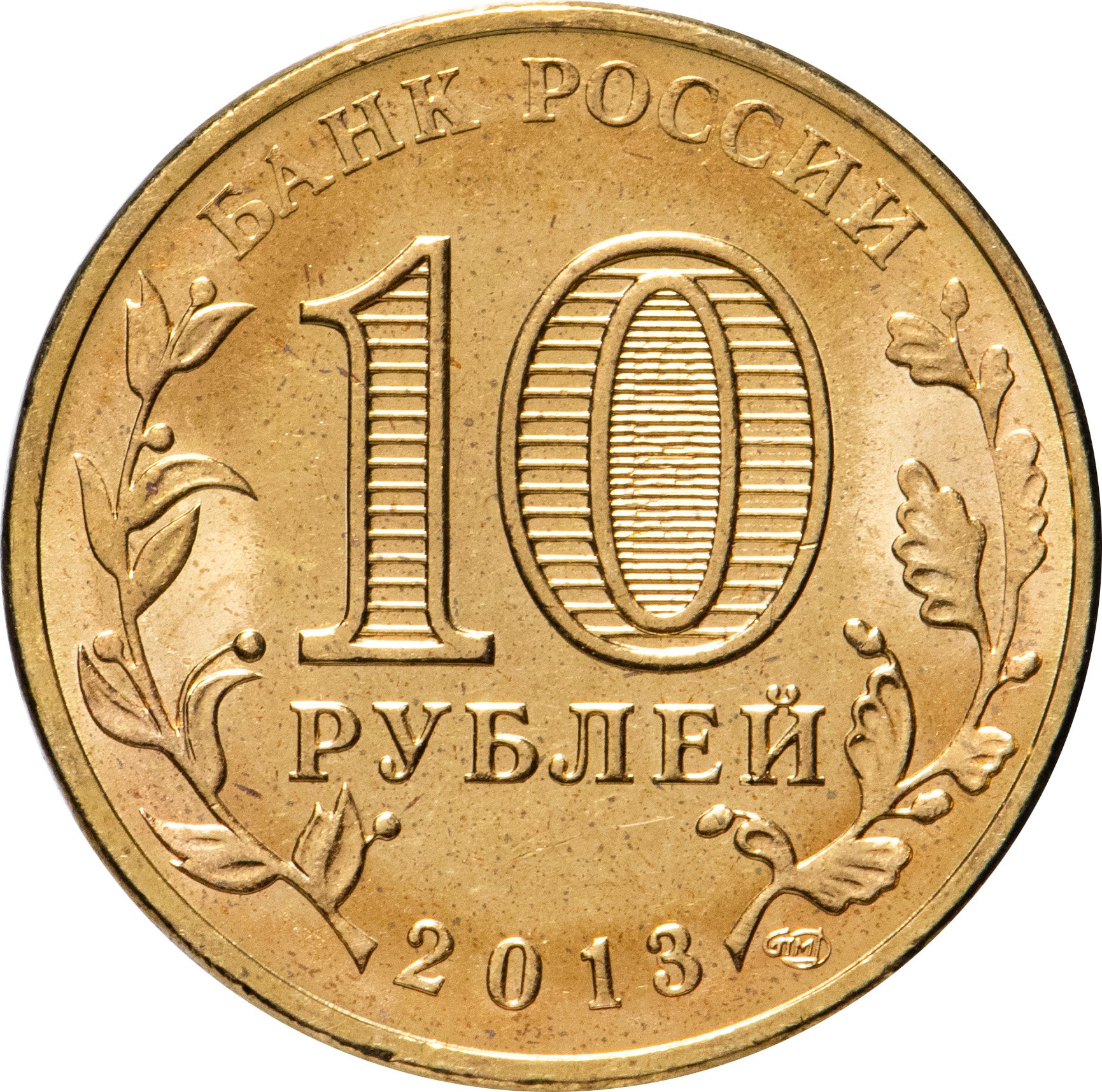 На аверсе - в центре указан номинал — стилизованная цифра десять, ниже слово "рублей". Характерная особенность — внутри цифры ноль при повороте на определенный ракурс можно увидеть число десять и слово "рубль". Под номиналом указан год выпуска - 2013, по обе стороны монеты стилизованный растительный орнамент. Ниже отчеканено фирменное обозначение Санкт-Петербургского монетного двора.