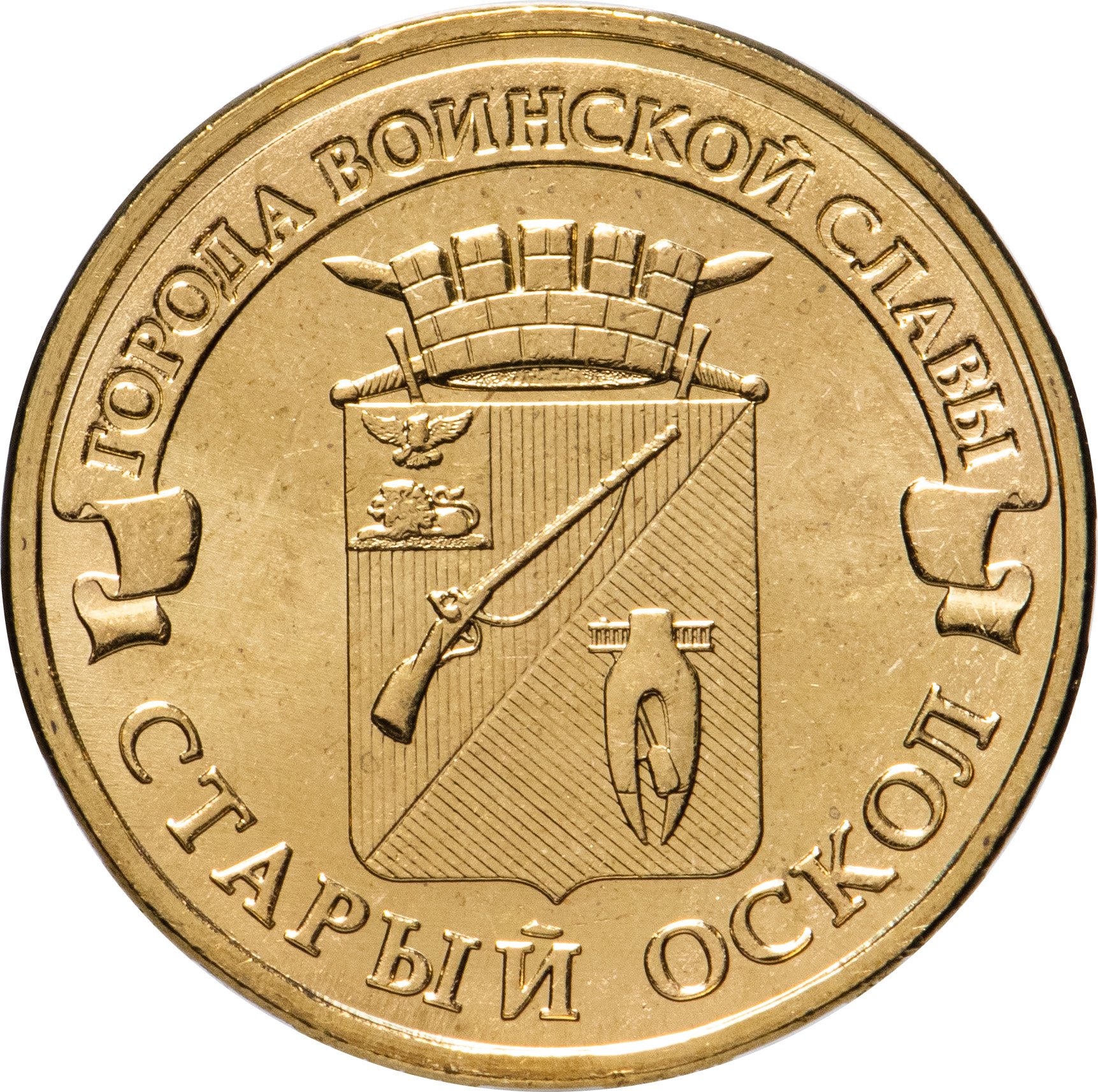 Серия «Города воинской славы» выпускалась в России в 2011-2016 годах. Изначально монеты чеканились в том же порядке, в котором присваивалось звание городам, но в 2014 порядок был нарушен. Монета «Старый Оскол» вышла в серии 27-ой, а в звание городу было присвоено 33-им.