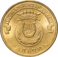 Нальчик получил звание Города Воинской Славы в 2010 году. 1 апреля 2014 года, 25-й в серии, вышла памятная монета «Города Воинской Славы: Нальчик». Аверс характерный для всех монет серии, а реверс украшает герб города: повёрнутая рогами вверх подкова, внутри которой за двуглавой горой восходит лазоревое солнце. Обрамляет её венок из веток голубой ели.