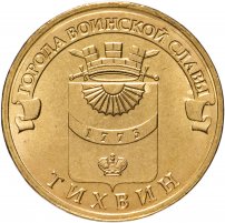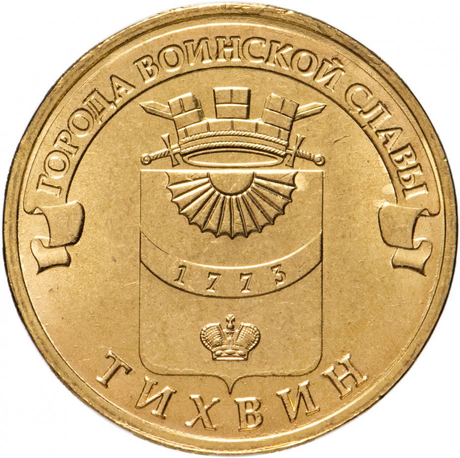 «Города воинской славы» (ГВС) – серия памятных монет Банка России, которая выходила с 2011 по 2016 год. Каждая из 45 отчеканенных 10-ти рублёвок посвящёна городу, защитники которого отличились особым героизмом, мужеством и стойкостью во время военных действий. Все монеты серии изготовлены из стали, с латунным гальванопокрытием. В 2011–2014 году ежегодно выпускали по 8 видов, в 2015 году в обращение вышло 9 разновидностей. Монету «Тихвин» отчеканили в 2014 году.