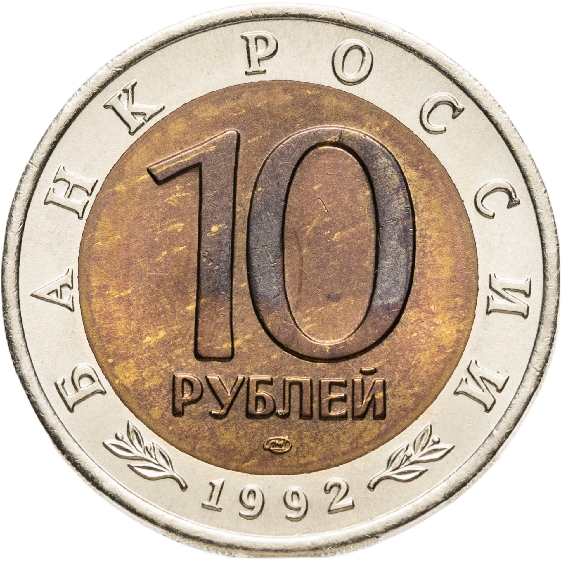 Сверху вдоль края монеты слова «БАНК РОССИИ», внизу год чеканки «1992», в середине номинал «10» под ним слово «РУБЛЕЙ», ниже монограмма монетного двора «ЛМД».