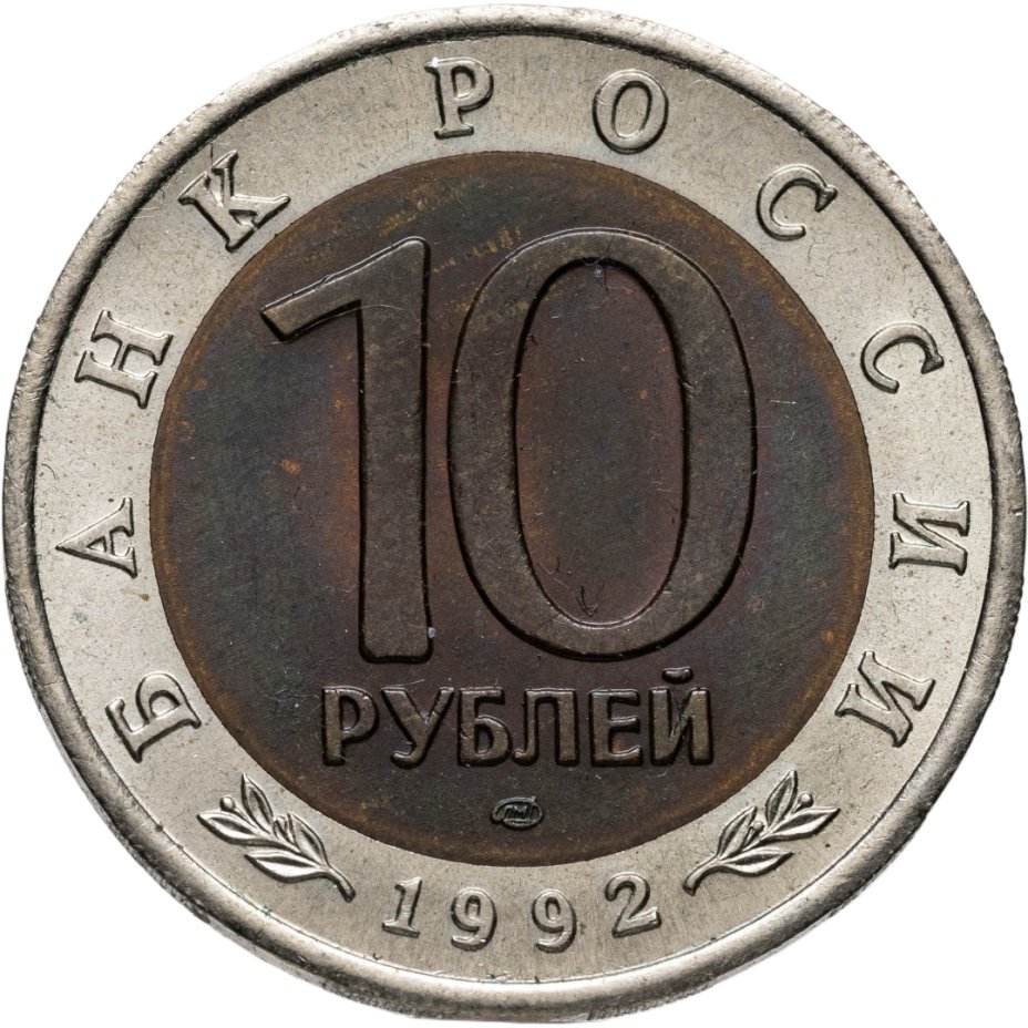 Сверху вдоль края монеты слова «БАНК РОССИИ», внизу год чеканки «1992», в середине номинал «10» под ним слово «РУБЛЕЙ», ниже монограмма монетного двора «ЛМД».