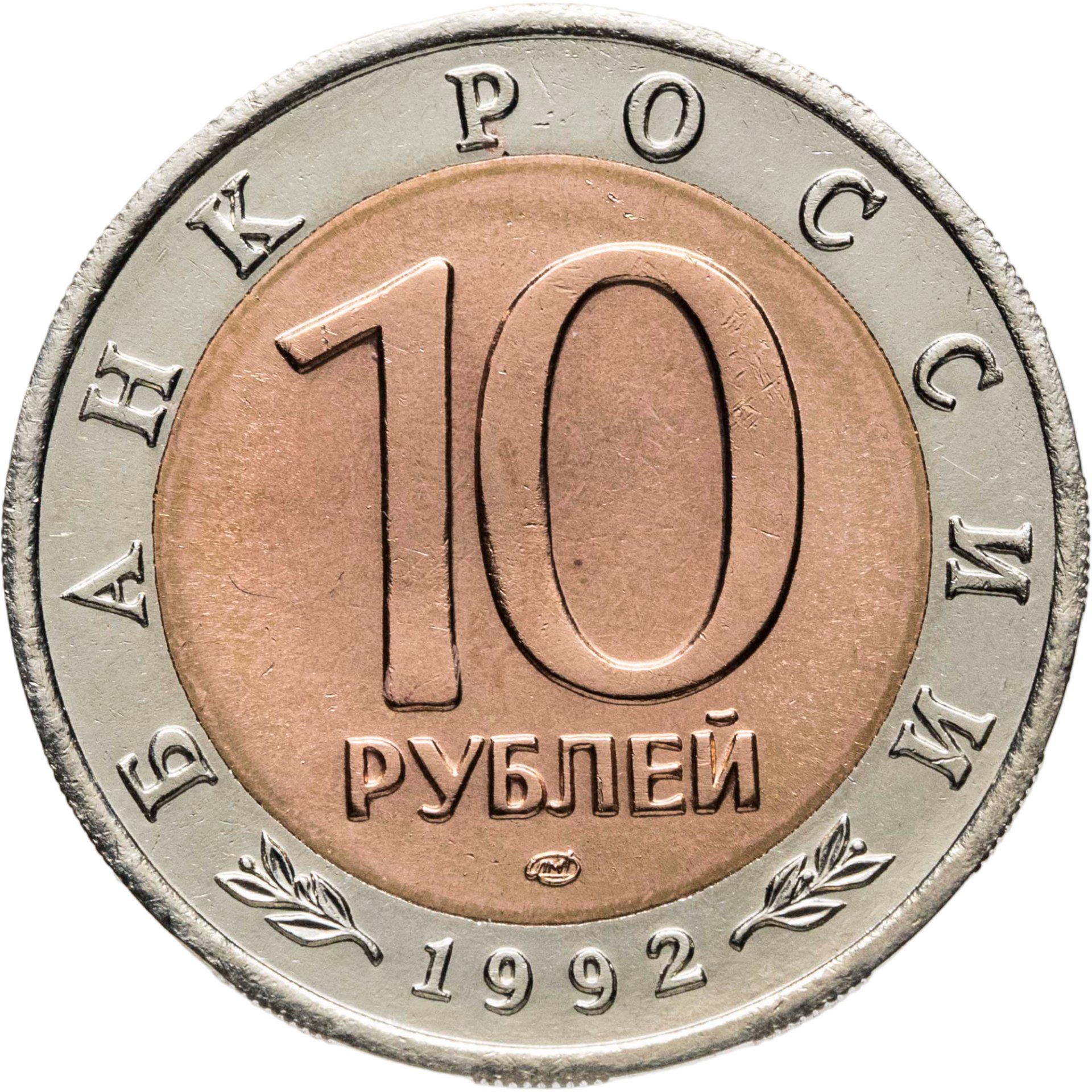 Сверху вдоль края монеты слова «БАНК РОССИИ», внизу год чеканки «1992», в середине номинал «10» под ним слово «РУБЛЕЙ», ниже монограмма монетного двора «ЛМД».