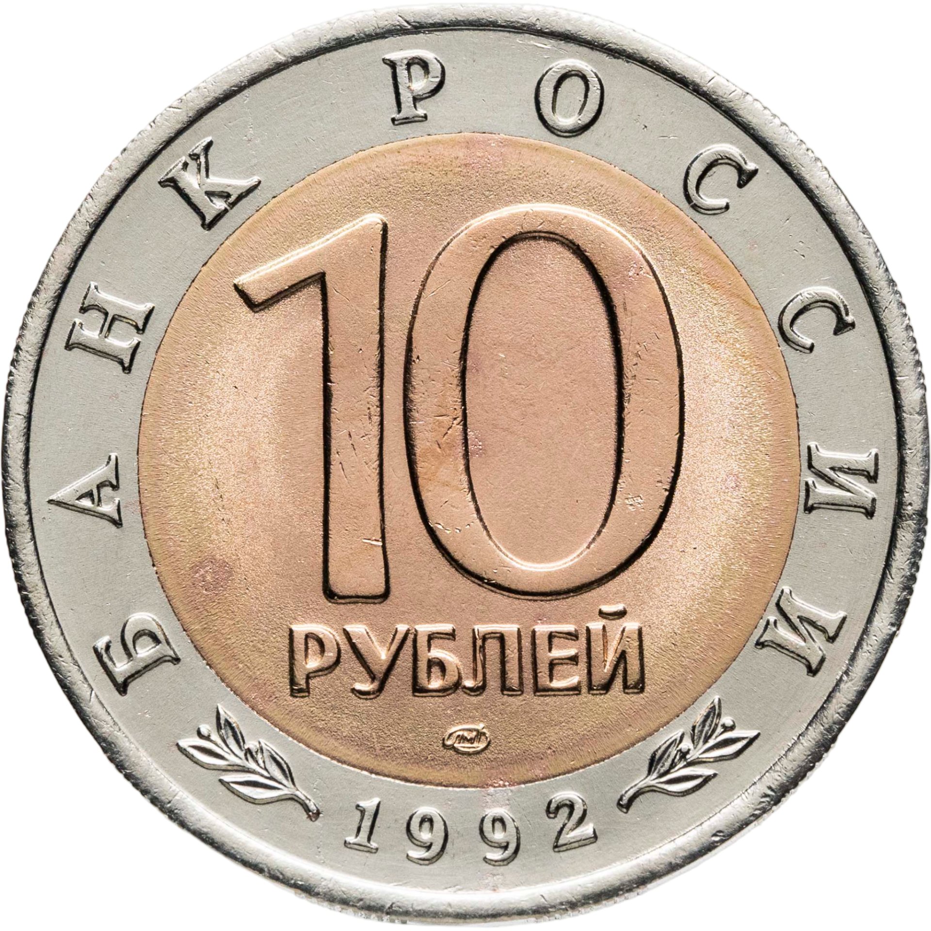 Сверху вдоль края монеты слова «БАНК РОССИИ», внизу год чеканки «1992», в середине номинал «10» под ним слово «РУБЛЕЙ», ниже монограмма монетного двора «ЛМД».